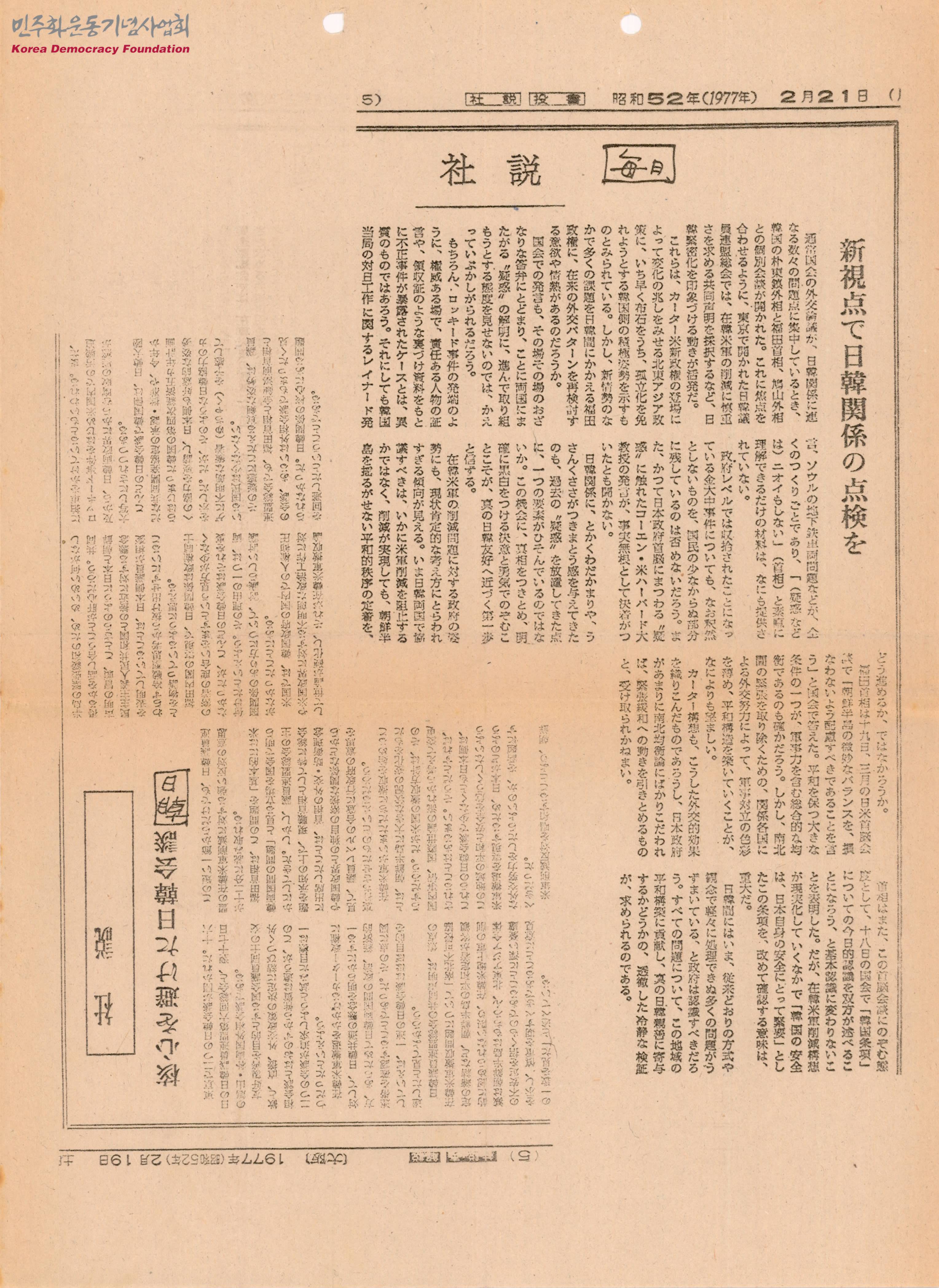 - 카터 행정부의 등장으로 변화의 조짐을 보이는 동북아 정세 속에서 종래의 외교 패턴에 기반한 후쿠다 정부의 어설픈 움직임을 지적하며, 이에 대한 전면적인 재검토가 필요함을 주장하는 사설의 스크랩과 도쿄에서 열린 이틀간의 한일회담에서 일본 정부는 변경될 여지가 없어 보이는 주한미군의 철수 방침을 반대하기보다는 주한미군이 철수하더라도 동북아의 평화와 안전이 위태롭지 않도록 하는 외교적 방안을 회담의 화두로 삼았어야 했다는 주장과 함께 일본이 한국의 경제개발 정책 협조 요청에 응하면서도, 한국과 일본의 유착관계에 대한 의혹에는 적극적으로 반응하지 않았음을 두고 이번 한일 회담을 핵심을 피한 회담으로 평가한 사설의 스크랩이 담긴 문서