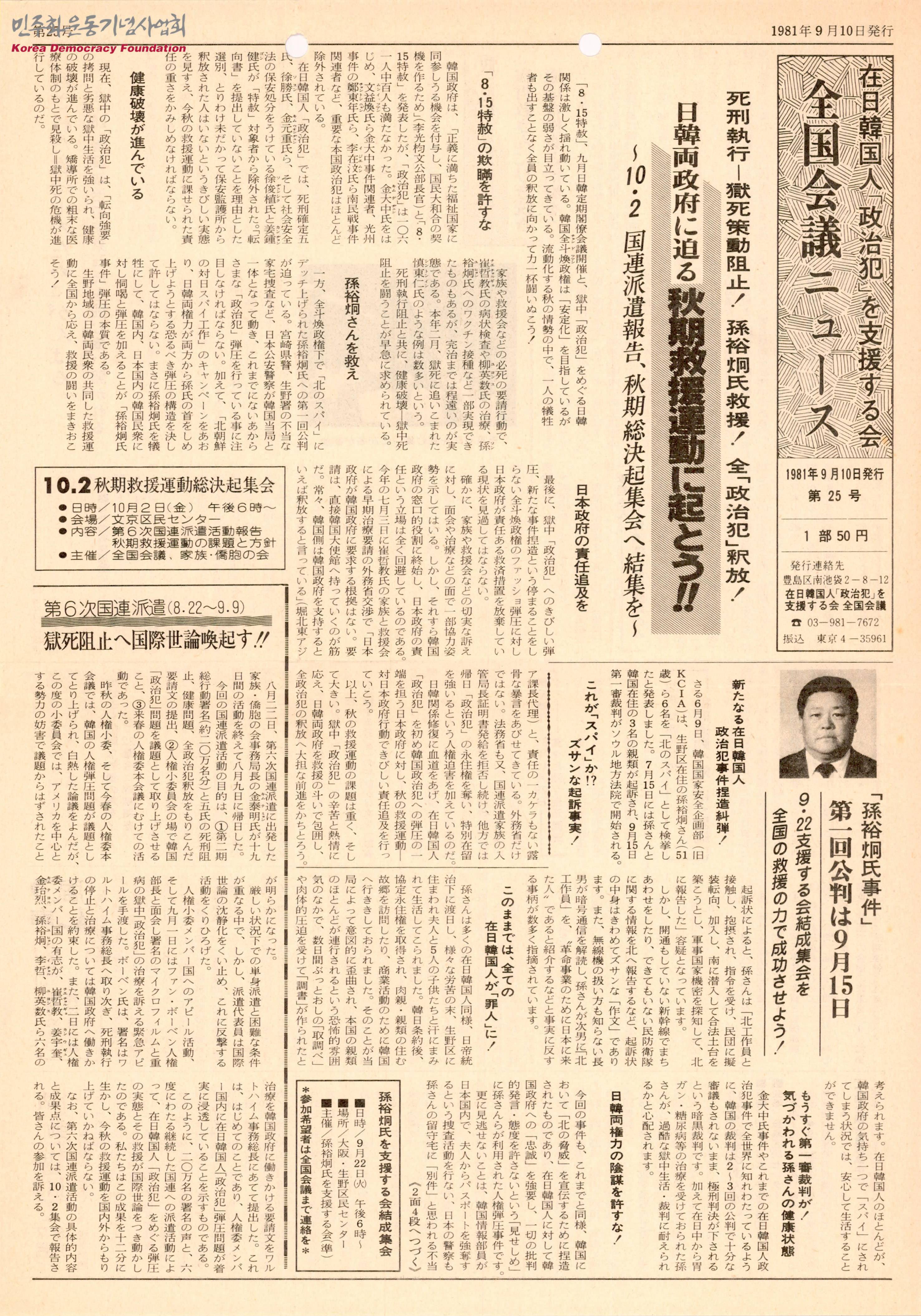 - 한국 정부가 8·15특사를 단행해 재일한국인 정치범을 포함한 1,061명을 사면했지만, 이중 정치범은 백 명이 채 되지 않으며, 김대중과 문익환을 비롯한 김대중사건 관련자들, 이재문과 정동년 등 남민전 사건 관련자들이 대상에서 제외되어 있음을 전하는 소식과 구속된 재일한국인에 대한 구제조치를 일본 정부가 책임을 가지고 진행하도록 추궁해야 한다는 내용의 글 등이 실린 정간물