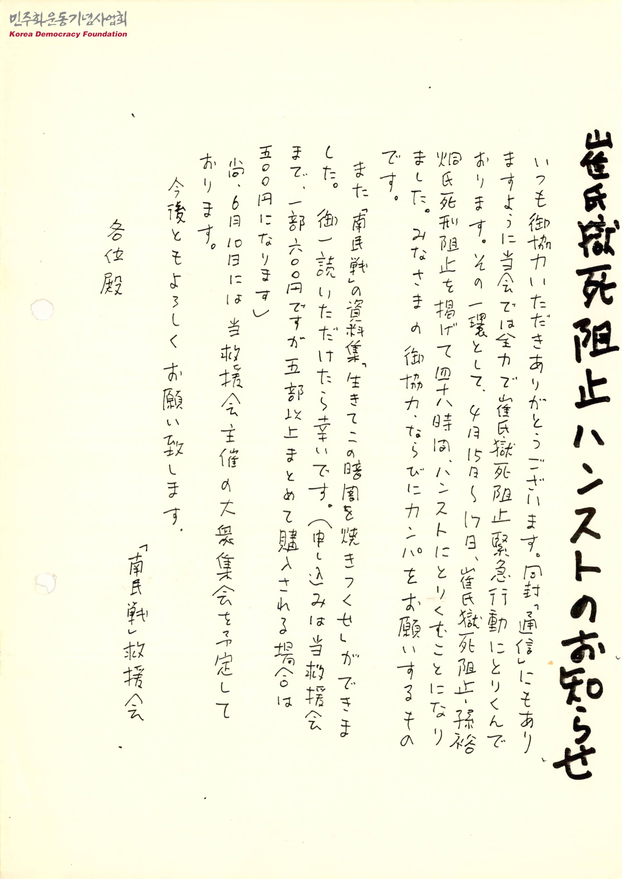 - 야마씨 사형 저지 단식운동과 관련하여 전력으로 옥사저지 긴급행동에 몰두하고 있으며 회원들의 관심과 협력을 요청하는 내용이 수록된 문서