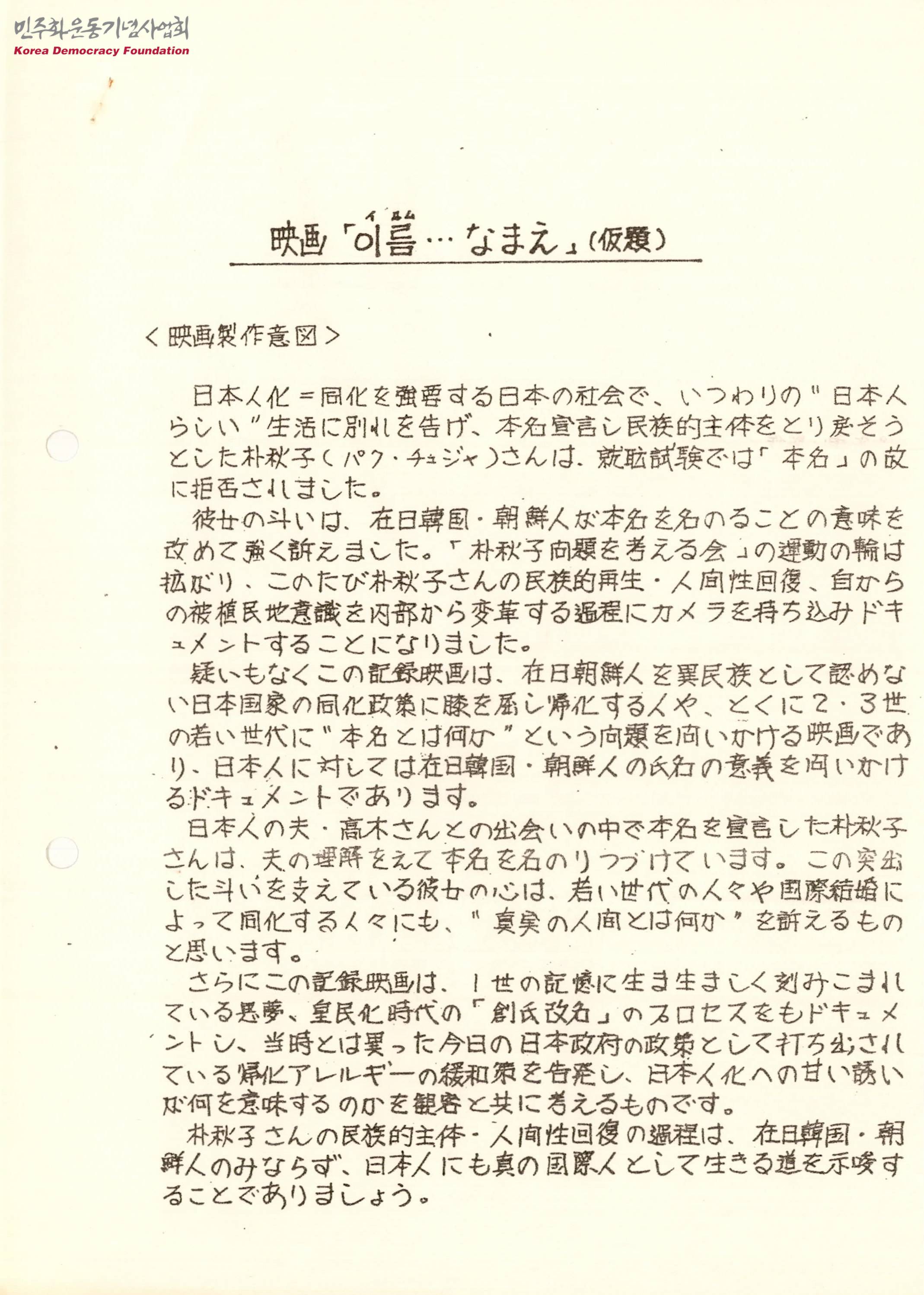 - 「이름」이라는 기록영화는 재일한국인을 이민족으로 인정한 일본 국가의 동화 정책에 무릎을 꿇고 귀화하는 사람이나, 특히 2∙3세대의 젊은 세대에 "본명이란 무엇인가"라는 방향 제목을 묻는 내용이며 일본인에 대해서는 재일한국인의 이름의 의의를 묻는 영화라는 내용이 수록된 문서
