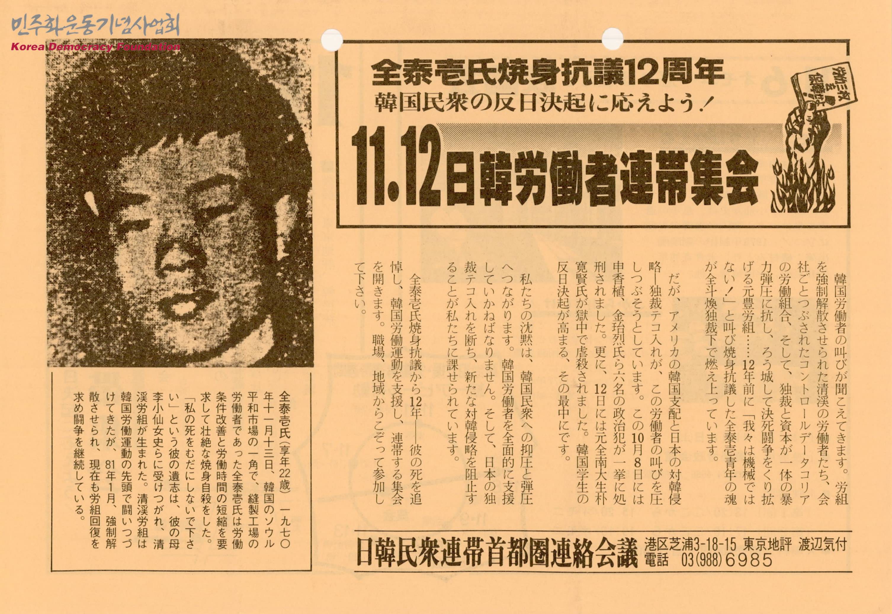 - 우리의 침묵은 한국 민중에게 억압과 탄압으로 이어지기에 한국 노동자를 전면적으로 지원해야 하고, 전태일 열사의 분신 12주기를 맞아 한일노동자연대집회를 개최하고 전태일 열사가 소속해있던 청계노조는 한국노동운동의 선두로 투쟁하였지만 강제해산 당해 현재도 노조회복의 요구투쟁을 계속하고 있다는 내용이 수록된 문서