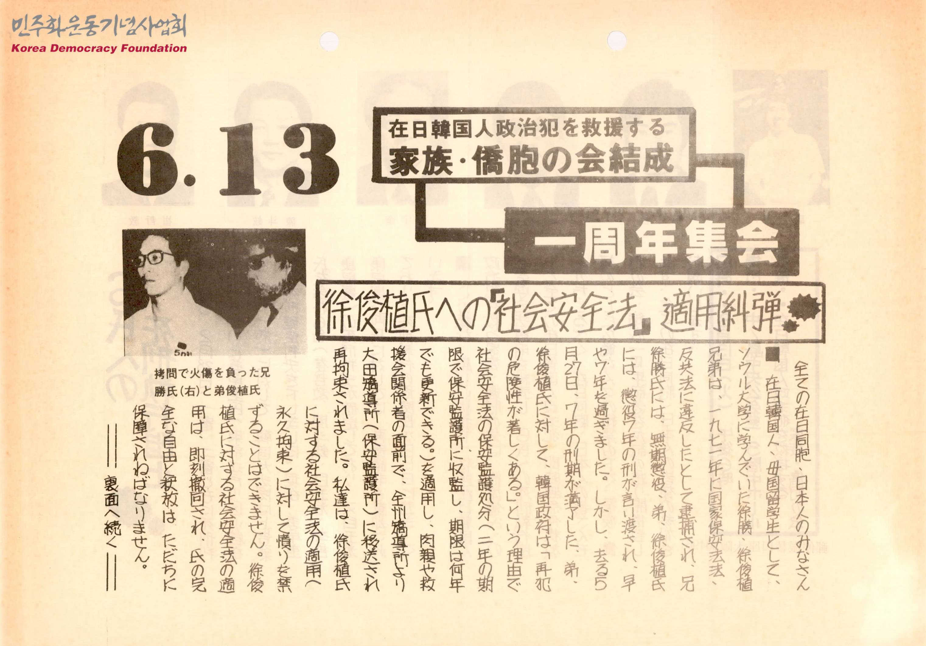- 학원침투 간첩단 사건으로 7년의 형기를 마친 서준식에게 사회안전법 보호감호처분이 내려져 재수감 된 것을 비판하며, 그에 대한 즉각 석방을 요구하는 글과 최철교, 백옥광을 비롯해 사형 판결을 받은 재일한국인 6명의 사형집행 금지와 재일한국인 정치범 즉시 석방을 위해 개최되는 재일한국인 정치범 가족 교포모임의 결성 1주년을 기념하는 집회에 참석을 요청하는 글와 행사 안내가 담긴 문서