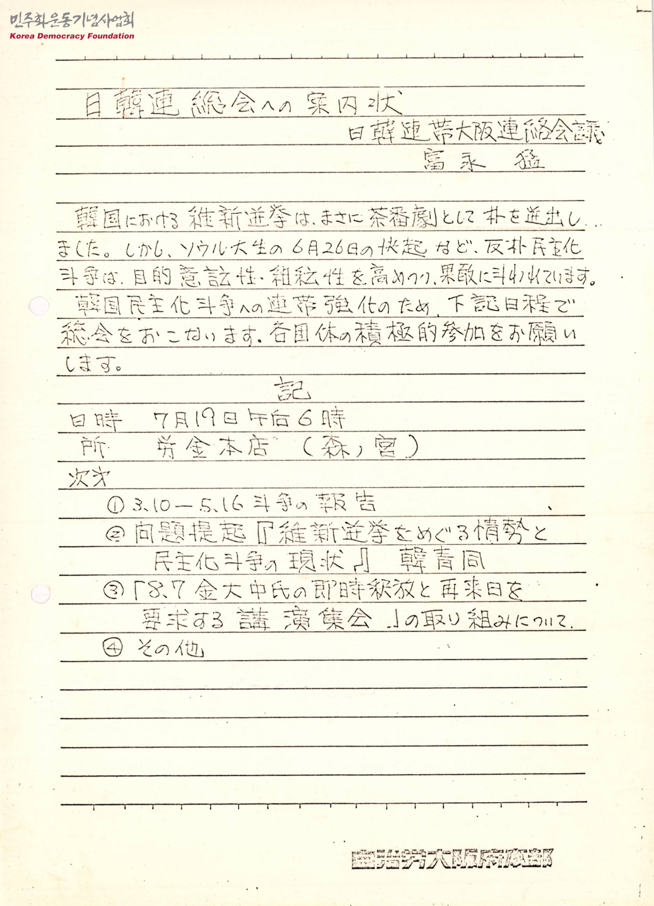 - 한국민주화투쟁 연대 강화를 위해 진행되는 총회에 참석할 것을 요청하는 글과 총회의 일정에 대한 안내가 담긴 안내문
