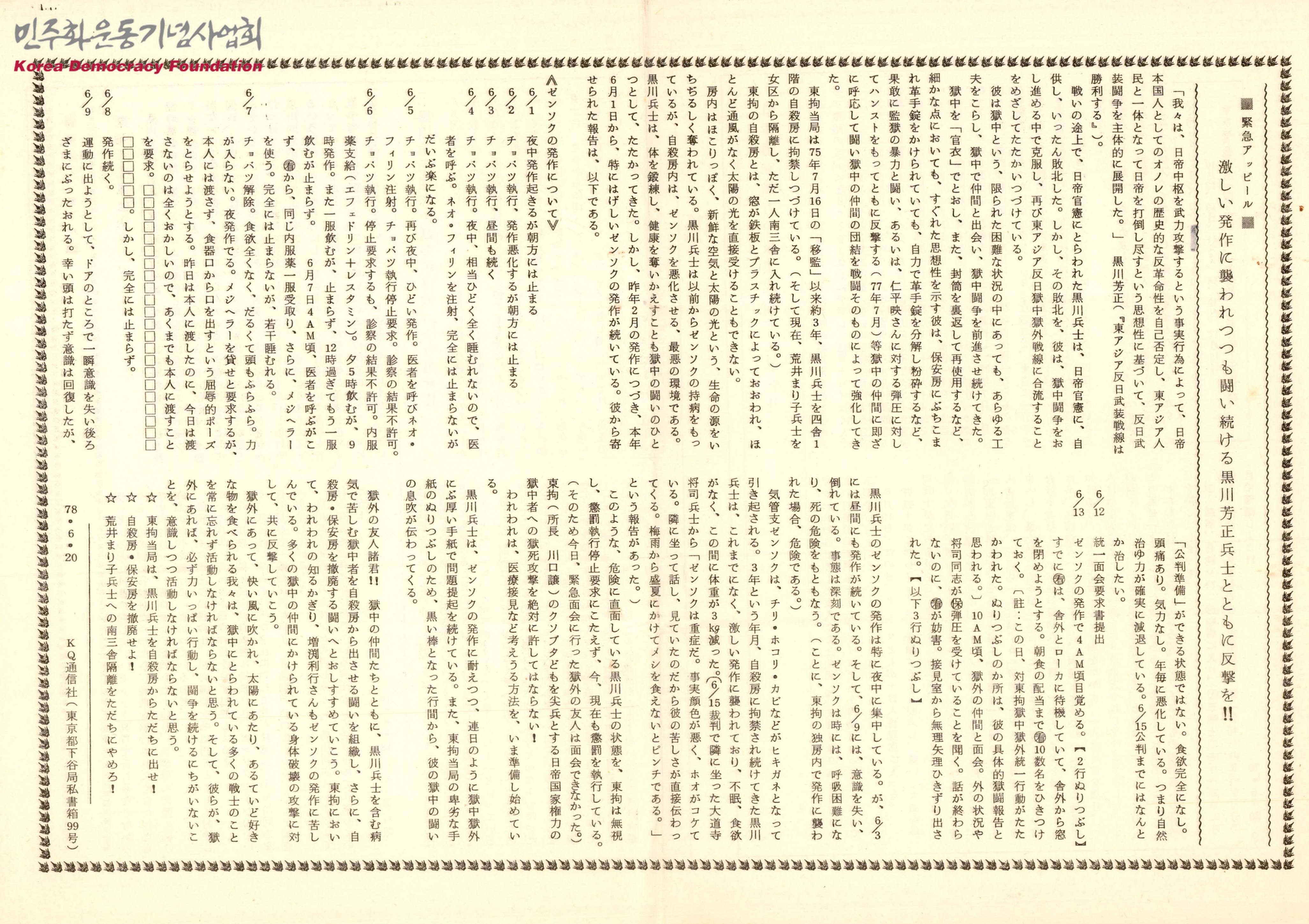 - 동아시아반일무장전선의 쿠로카와 요시마사가 진행한 옥중투쟁과 옥중 생활로 겪고 있는 어려움 등을 전하며, 옥외에 있는 우리들이 쿠로카와와 같은 이들을 잊지말고 활동해야 함을 주장하는 글이 담긴 문서와 "동아시아 반일 무장 전선을 구원하는 통신"의 준비호, 1호, 2호의 구성 내용 등이 담긴 문서의 모음