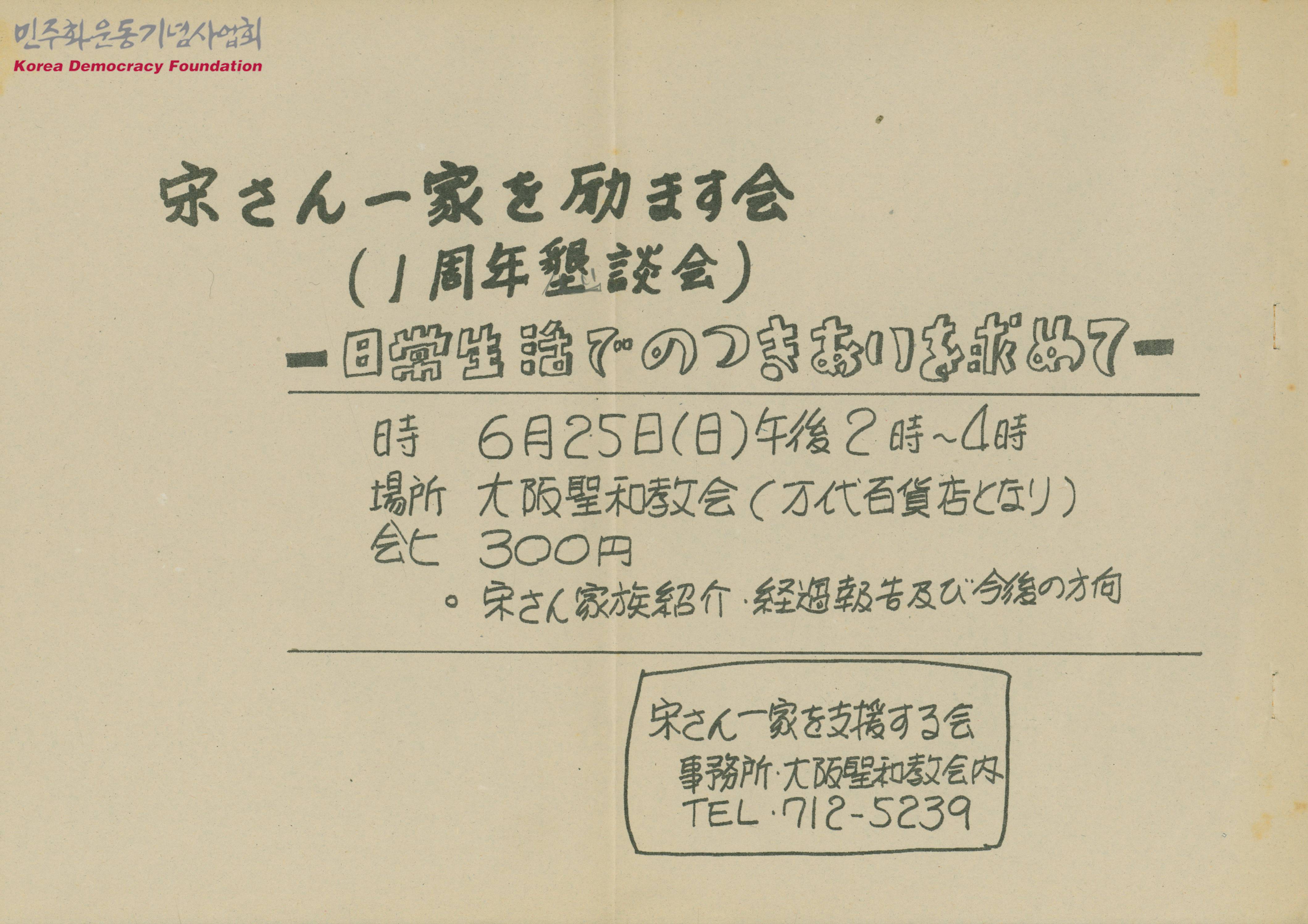 - 송씨 일가의 약력, 성교회와 이쿠노 지역 사람들에게 덕분에 한 해를 맞이할 수 있었고 일본에서 살수 있었다는 내용의 글, 수감되었던 아버지가 나온 후에 겪었던 일 등의 내용이 담긴 간담회 문서