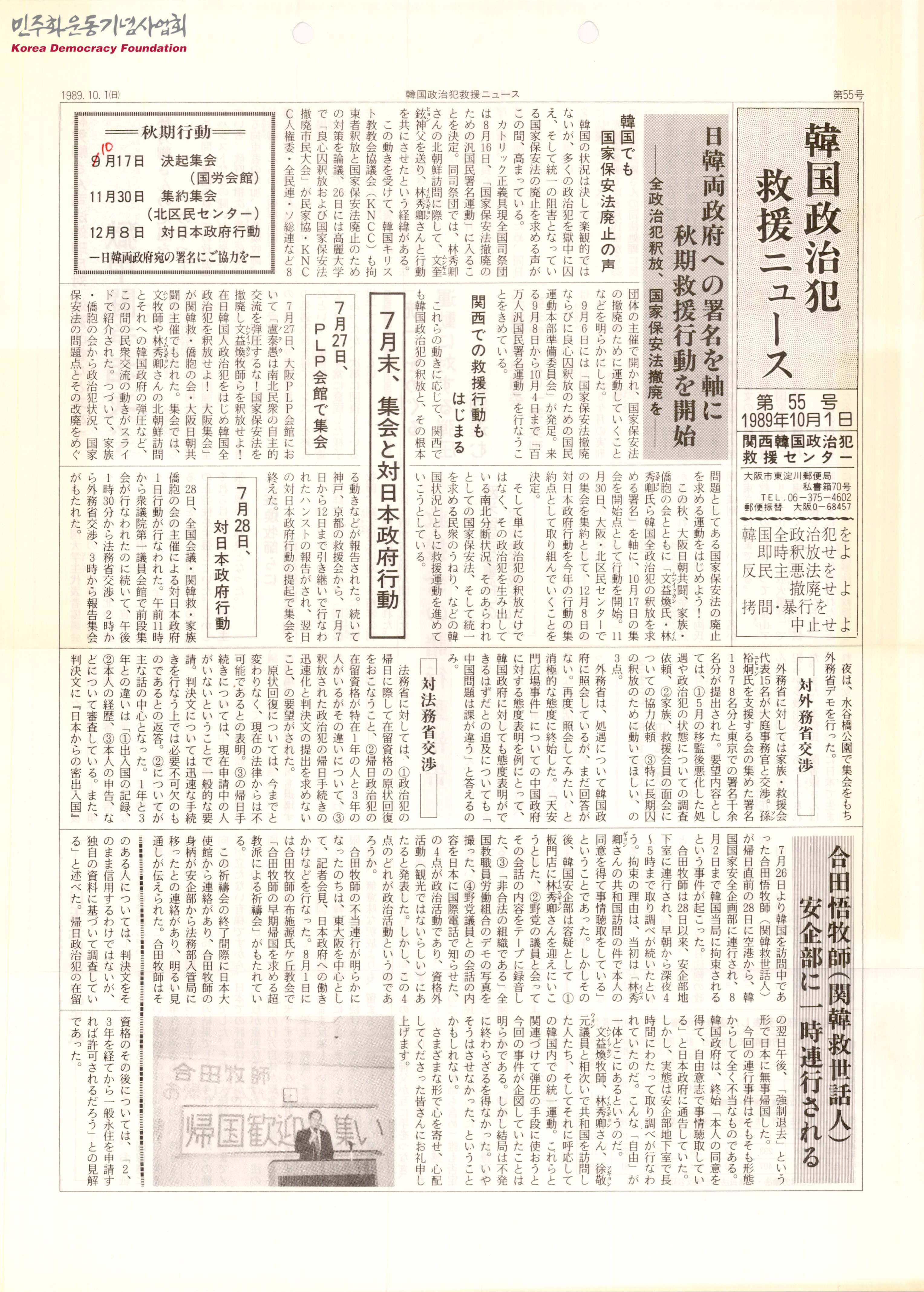 - 한일양국 정부 서명을 축으로 전정치범 석방과 국가보안법 철폐를 위한 추계 구호 행동이 개시되었다는 것, 한국에서의 국보법 폐지 목소리에 호응하기 위해 관서지방에서의 구원 행동이 시작되었다는 것, 임수경 사법처리 반대 및 처우 개선을 위한 옥중투쟁이 잇따르고 있다는 것, 구미유학생 사건의 구원회가 결성되었다는 것 등의 내용이 수록된 소식지