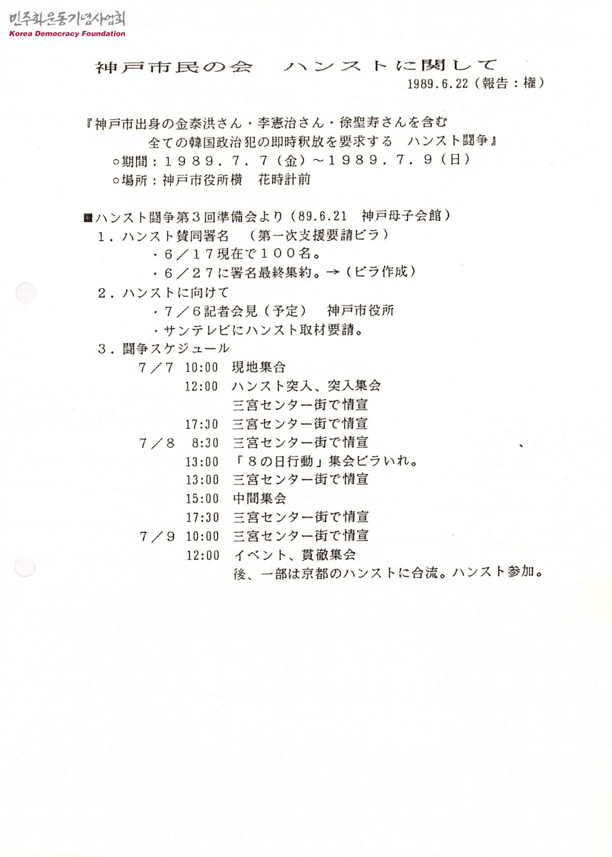 - 고베시 출신 김태홍, 이헌치 등을 포함한 모든 한국 정치범의 즉각 석방을 요구하는 단식투쟁의 기간과 장소, 향후 일정이 적힌 문서와 장의균의 옥외치료 석방을 요구하는 72시간 단식의 일정이 적힌 문서