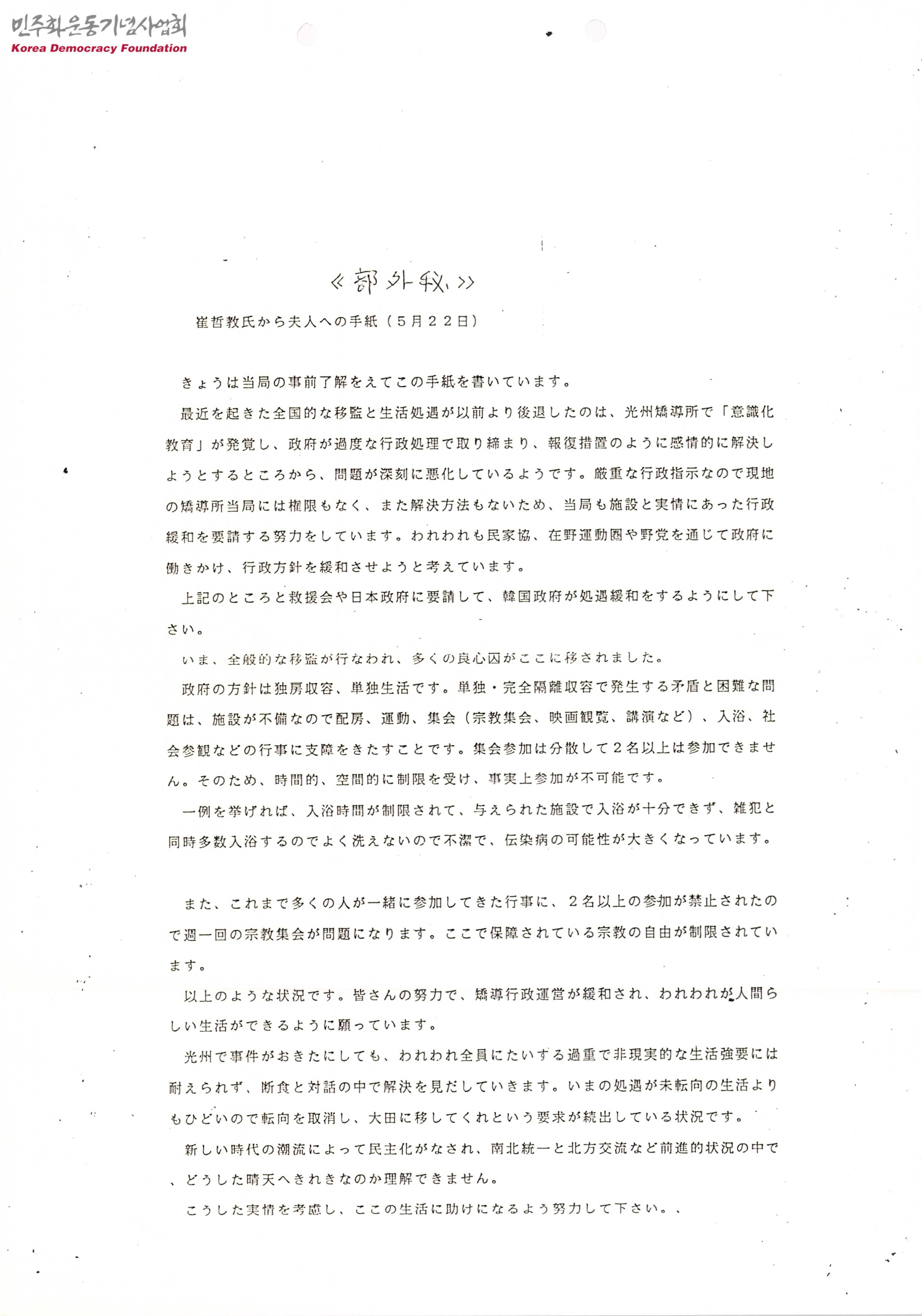 - 전국적으로 이감과 생활 처우가 후퇴한 이유는 광주교도소에서 진행된 의식화 교육이 발각된 것에 대한 정부의 보복조치라는 것, 독방수용과 단독생활이라는 정부의 방침에 따라 2인 이상은 어떤 집회든 참석할 수 없으며 시간적 공간적 제한이 심해 종교집회 역시도 마음대로 할 수 없다는 것 등을 말하며 이러한 실정을 고려해 이곳 생활에 도움이 되도록 노력해 달라는 내용의 서신