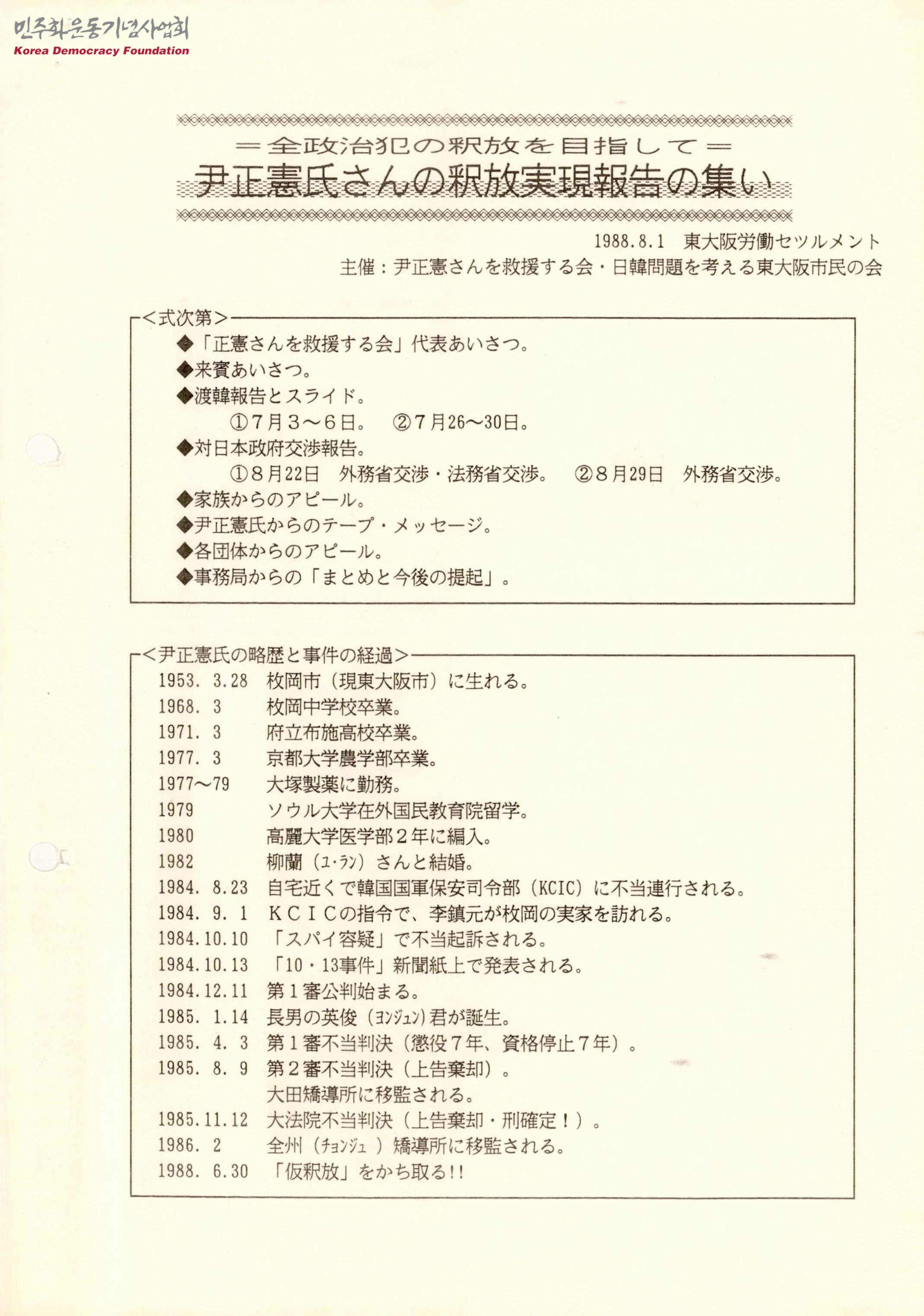 - 윤정헌 씨를 구하는 모임 대표의 인사말, 내빈인사, 대일본 정부 협상 보고, 가족 및 각 단체의 호소문, 외무성 및 법무성 협상 등의 내용이 수록된 식순과 윤정헌 씨의 약력, 윤정헌 씨 구명운동의 경과 내용 등이 수록된 문서