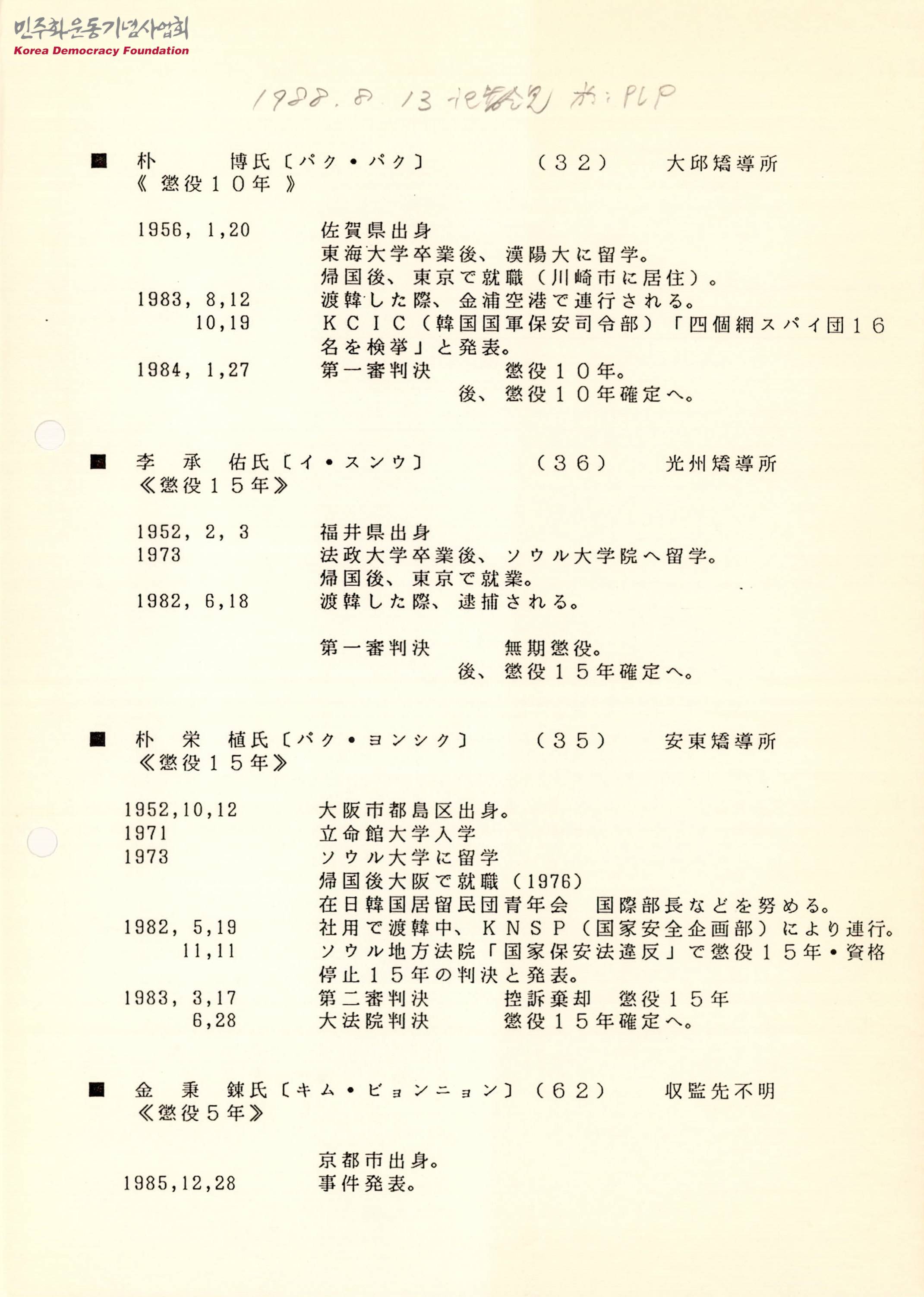 - 재일 한국인 정치범 명단으로 일본에 생활기반이 있는 재일 한국인 17명, 전 재일 한국인 또는 장기체류자 16명의 교도소, 이름, 나이, 생년월일, 체포일, 형량, 수감번호, 출신지 등의 내용이 수록되어 있으며, 박박, 이승우, 박영식, 김병연의 체포 전 활동 내역, 1심 판결 내용 등이 함께 정리되어 있는 문서