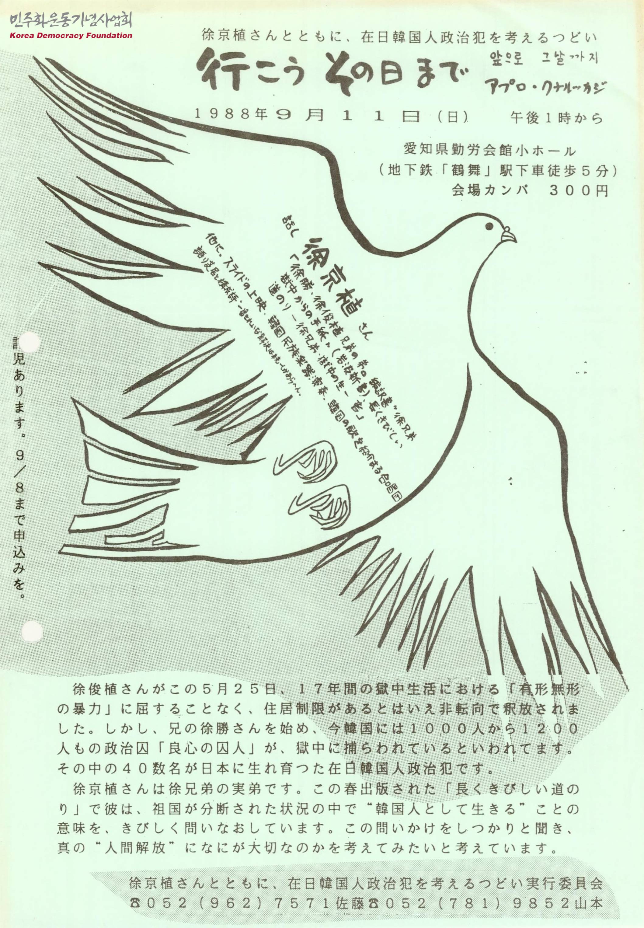 - 5월 25일 서준식 씨가 17년 간의 옥중생활에서 유·무형의 폭력에 굴복하지 않고 주거제한이 있지만 비전향장기수로 풀려났다는 내용, 하지만 형 서승 씨를 비롯해 한국에는 1천 명에서 1천 2백 명의 정치범 양심수가 감옥에 갇혀 있는 것으로 알려져 있으며 그 중 40여 명이 일본에서 나고 자란 재일 한국인 정치범이라는 내용, 서형제의 친동생인 서경식 씨는 조국이 분단된 상황 속에서 한국인으로 산다는 것이 무엇을 의미하는지 되묻고 있으니 이 물음에 귀를 기울여 진정한 인간 해방이 무엇인지 생각해보자는 내용 등이 수록된 문서