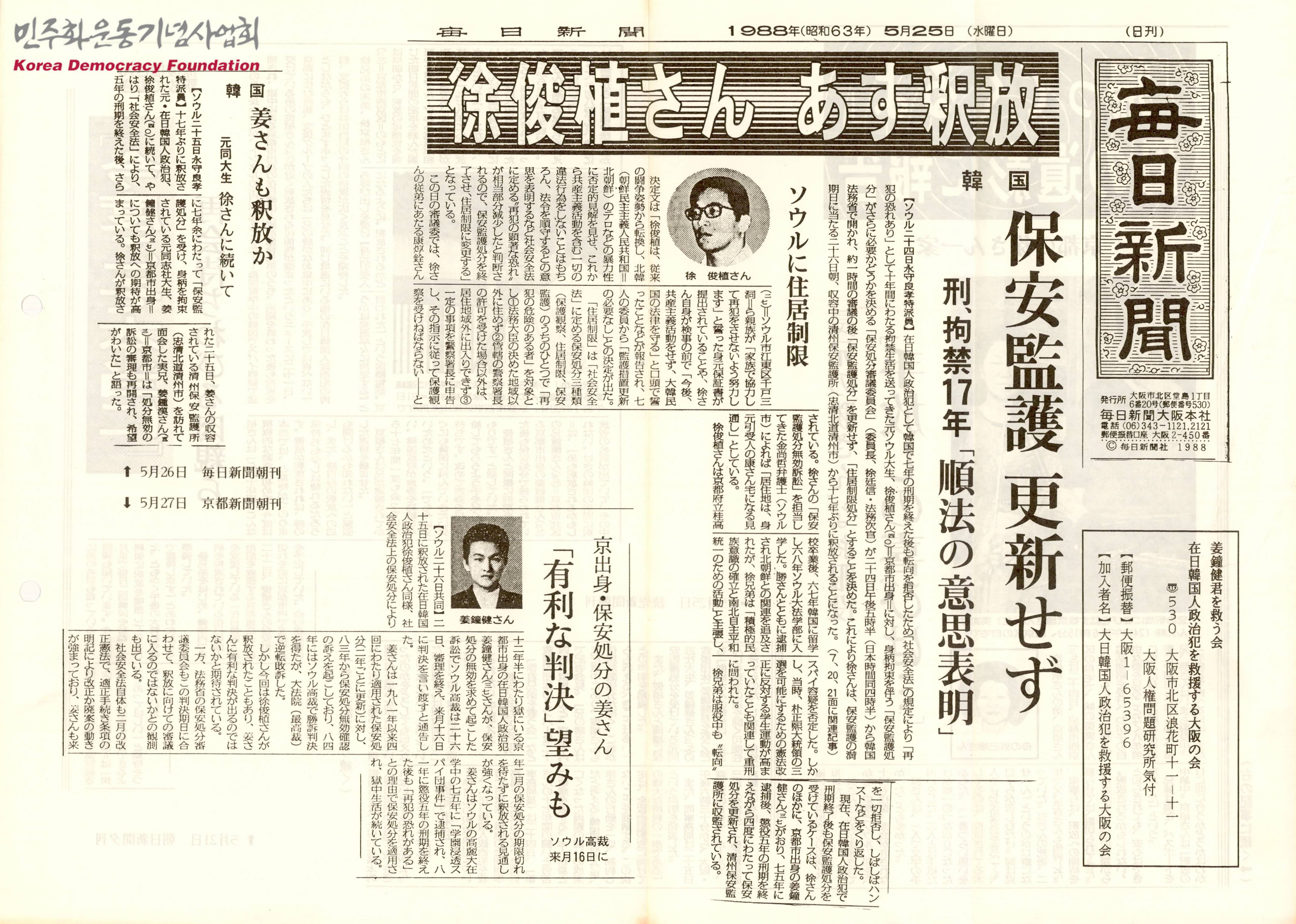 [신문스크랩] 서준식씨 석방 관련