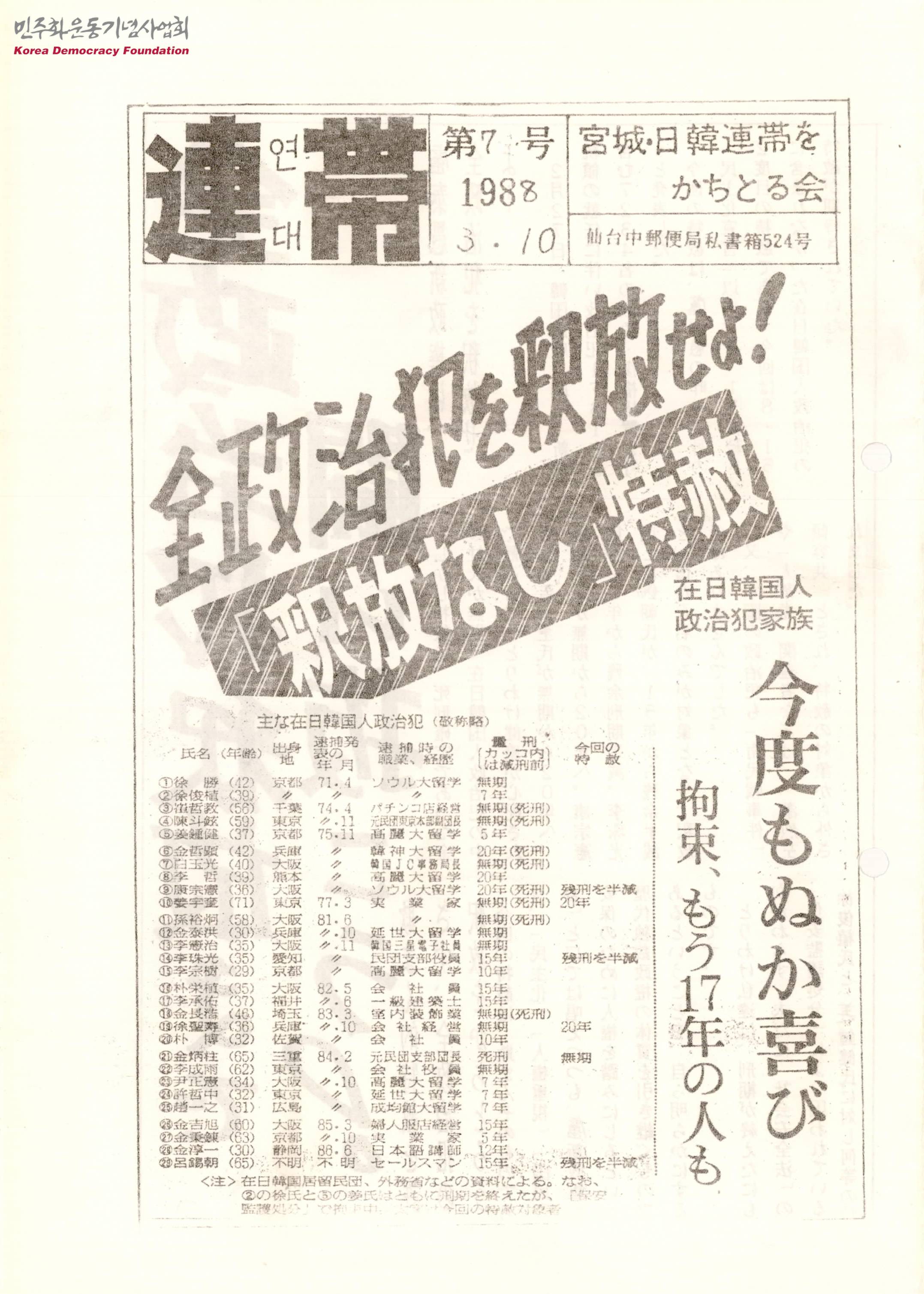 - 1988년 2월 27일 한국 정부 당국은 새 대통령 취임과 함께 정치범 1,731명을 포함한 7,234명에 대한 사면조치를 단행했으며 1987년 6월 민주화 선언 특사 때 포함되지 않았던 재일 한국인 정치범의 특사가 기대되었다는 내용, 하지만 본국의 정치범도 남민전 사건과 관련된 자 등은 열공으로 분류되어 특별 사면 대상에서 제외되었으니 기만적 사면을 허용하지 말고 모든 정치범의 석방을 쟁취하자는 내용 등이 수록된 문서