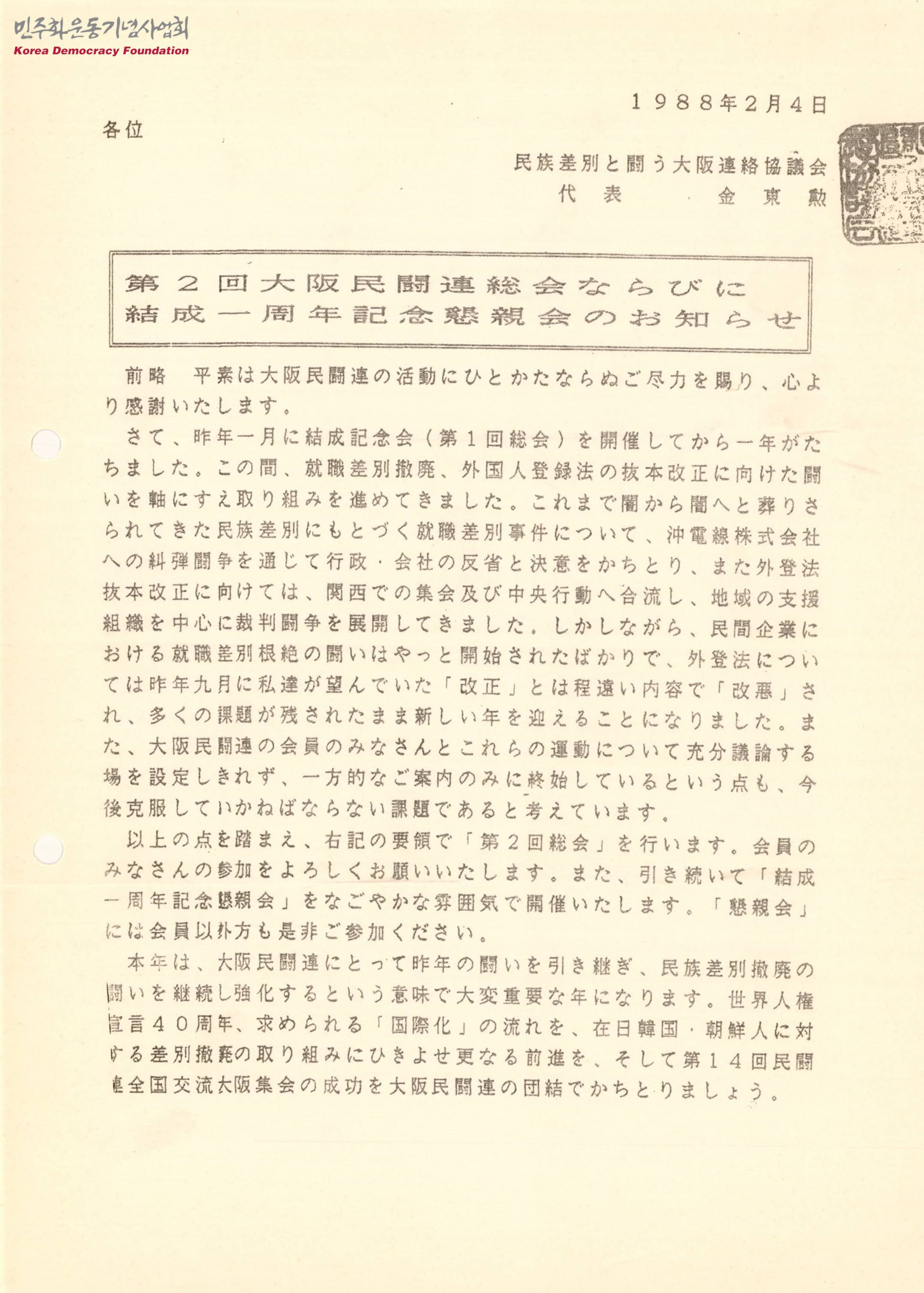 - 그동안 취업차별 철폐, 외국인등록법 교본 개정을 위한 활동을 중심으로 진행해왔으나 민간기업에서의 취업차별 근절 투쟁은 이제 막 시작되었고, 외국인등록법은 개정과는 거리가 먼 내용으로 개악되었으니 이러한 운동에 대해 충분히 논의할 수 있도록 제2회 총회를 개최하고자 하니 회원들의 많은 참여를 부탁한다는 내용, 세계인권선언 40주년을 맞이하여 국제화의 흐름을 재일조선인에 대한 차별철폐 투쟁에 끌어들여 더욱 전진하는 단결로 쟁취하자는 내용 등이 수록된 문서