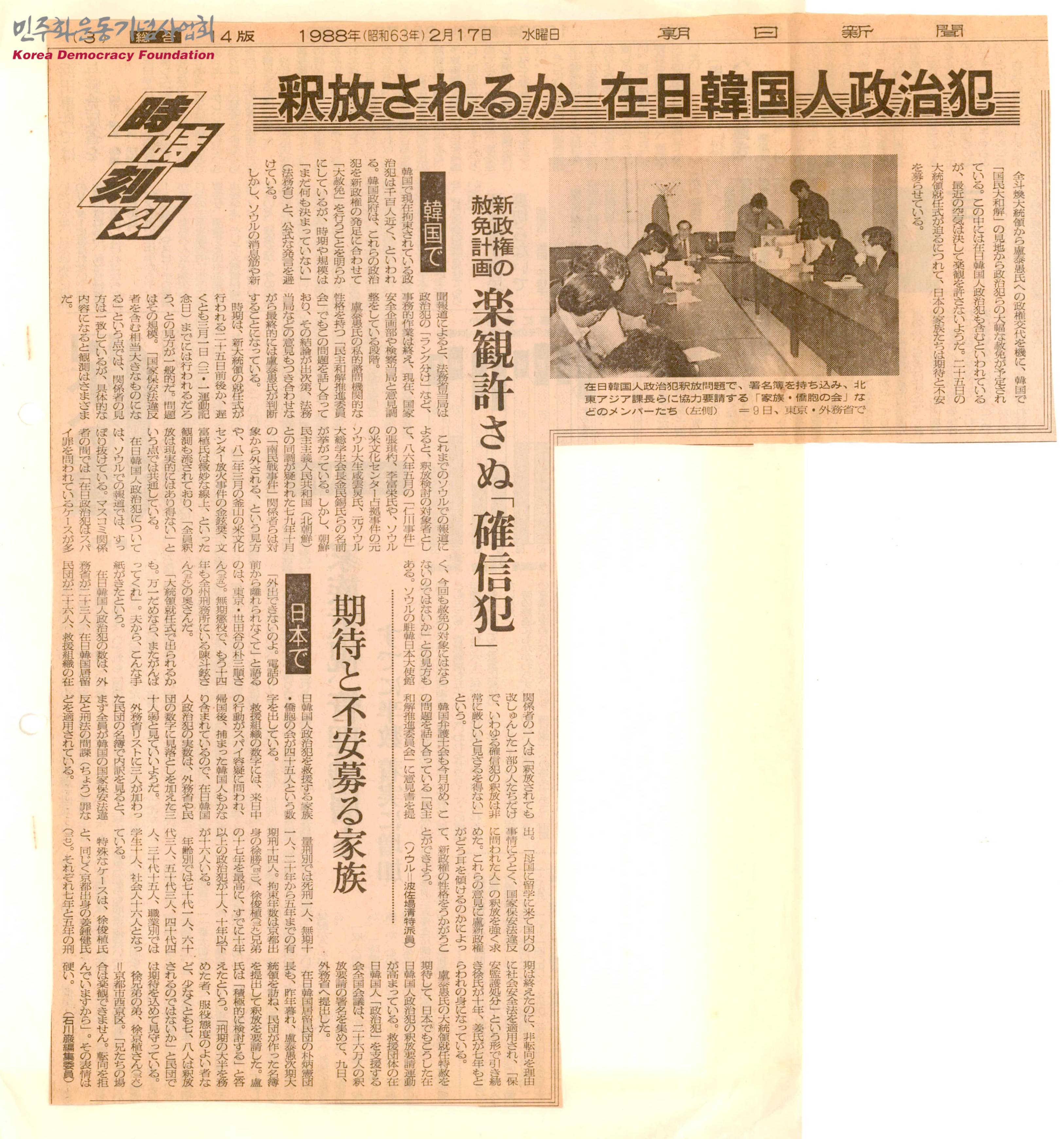 - 한국에서 구속된 정치범은 1600명에 육박하는 것으로 알려져 있으며 한국 정부는 이들을 새 정부 출범과 함께 대사면을 실시할 것임을 밝혔으나 시기나 규모는 아직 아무것도 정해지지 않았다고 공식적인 언급을 피했으며, 지금까지의 서울 보도에 따르면 석방 검토 대상자에서 남민전 사건 관련자, 부산 미문화원 방화사건 관련자 등은 제외되었으며, 한국변호사협회는 재일 한국인 정치범의 석방을 강력히 요구했다는 내용 등이 수록된 문서