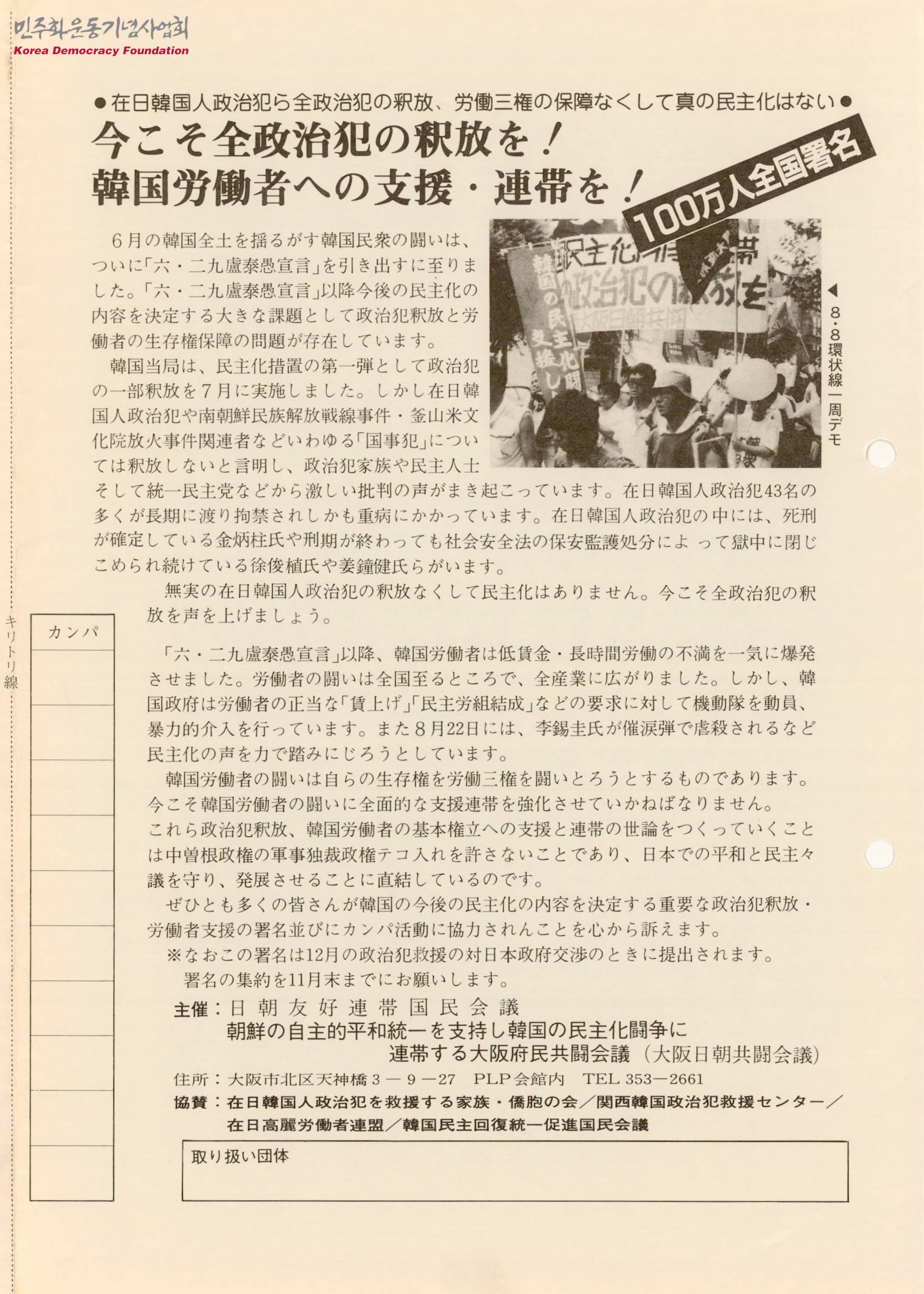 - 6월 한국 전역을 쥐 흔든 한국 민중의 투쟁은 마침내 6.29민주화 선언을 이끌어냈지만 향후 민주화의 내용을 결정하는 큰 과제로 정치범 석방과 노동자 생존권 보장의 문제가 존재한다는 내용, 한국 정부는 노동자들의 정당한 임금인상과 민주노조 결성 등의 요구에 대해 기동대를 동원해 폭력적으로 개입하고 있으니 한국의 향후 민주화의 내용을 결정짓는 정치범 석방 및 노동자 지원 서명캠페인에 많은 분들의 동참을 호소한다는 내용 등이 수록된 문서