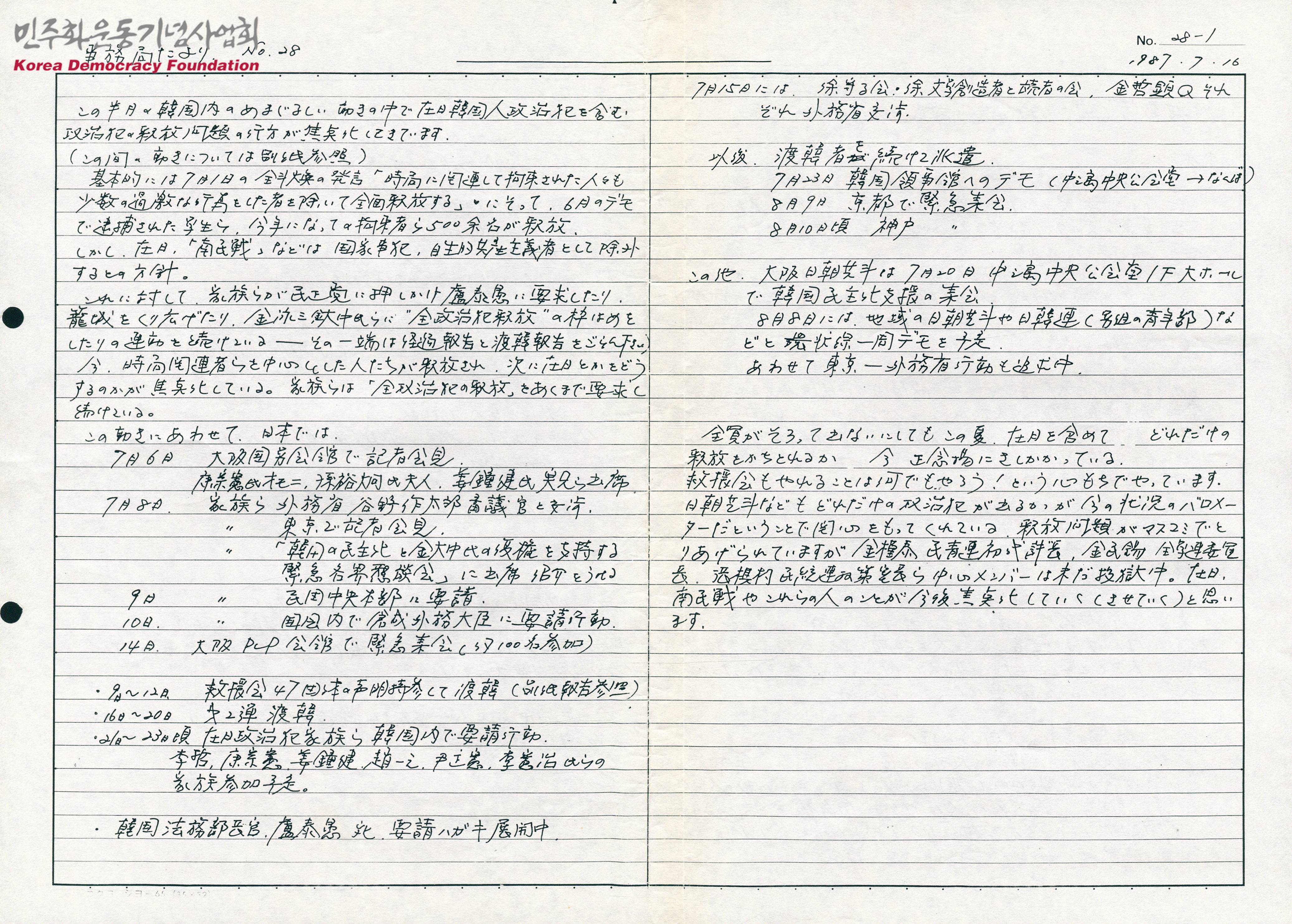 - 정치범의 석방에 대한 전두환의 발언인 '소수의 과격한 행위를 한 자를 제외하고 전면 석방한다'에 의해 재일한국인 정치범, 남민전 등은 제외되었다는 내용이 수록된 것으로 추정되는 문서