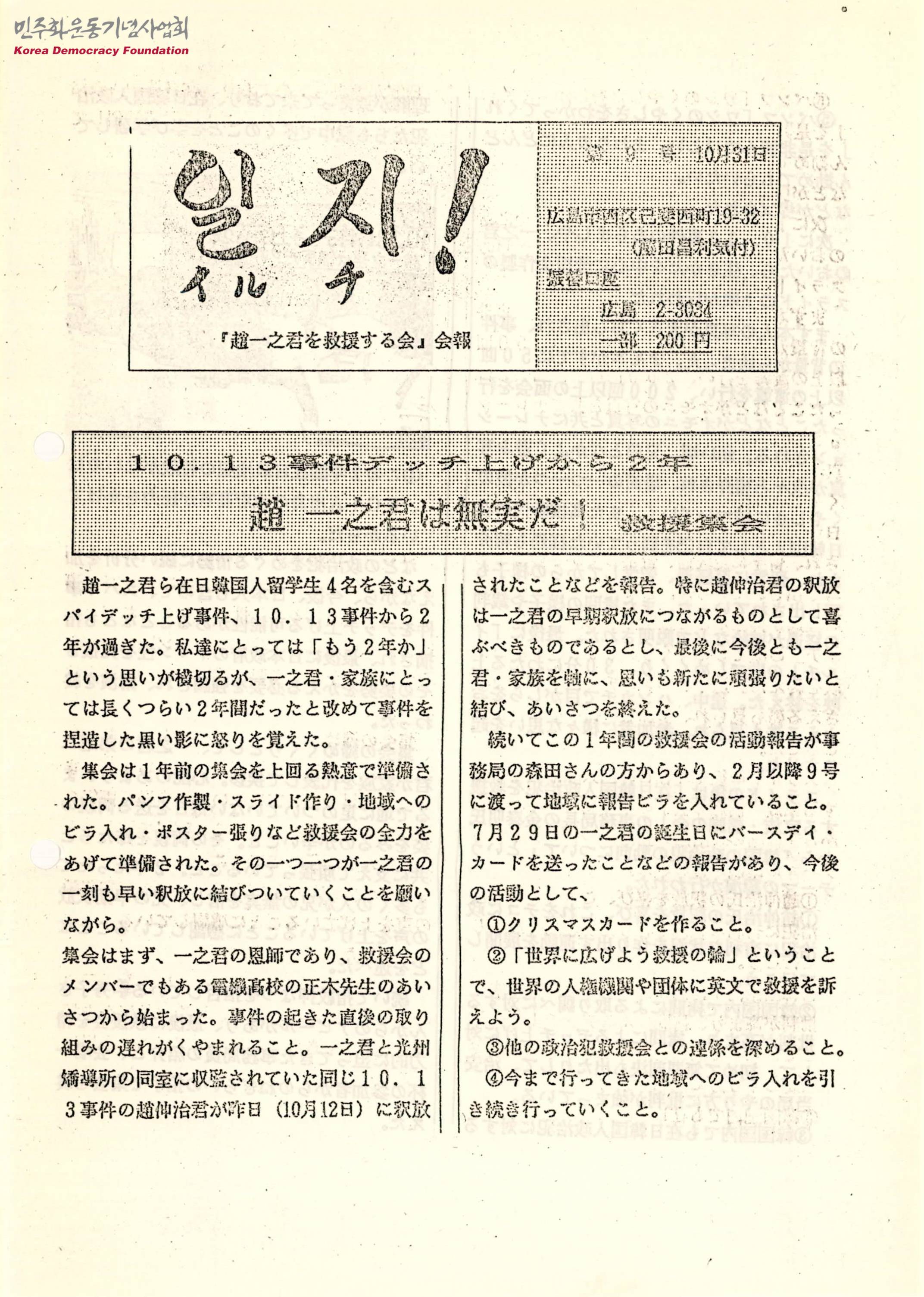- 조일지군을 포함한 재일한국인 유학생이 구속된 10. 13사건 이후 2년이 지난 시점에서 조일지군의 무고를 주장하는 구원집회가 열렸다는 내용, 조일지군의 무고함을 주장하는 내용 등이 수록된 정간물