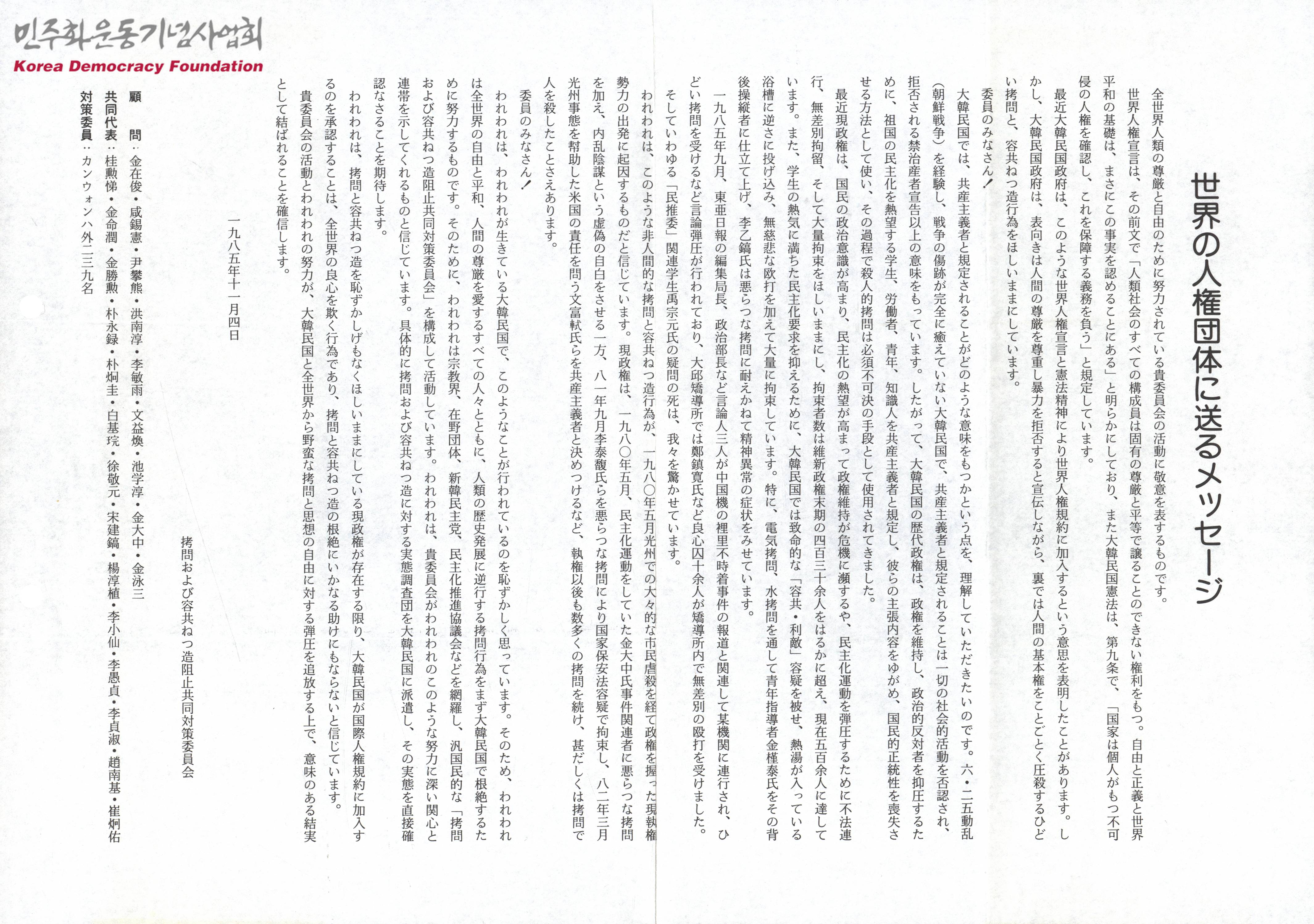 - 최근 전두환 정권은 세계인권선언과 헌법정신에 따라 세계인권규약에 가입하겠다는 의사를 밝혔으나, 겉으로는 인간의 존엄성을 존중하고 폭력을 거부한다고 선전하면서 뒤로는 인간의 기본권을 짓밟는 끔찍한 고문과 용공조작 행위를 서슴없이 자행하고 있다는 내용, 고문 및 공갈 협박에 대한 실태조사단을 대한민국에 파견하여 그 실태를 직접 확인해주기를 바란다는 내용, 민주화실천가족운동협의회 출범에 즈음한 성명서, 동아일보에서 본 한국에서의 인재 억압 등의 내용이 수록된 문서