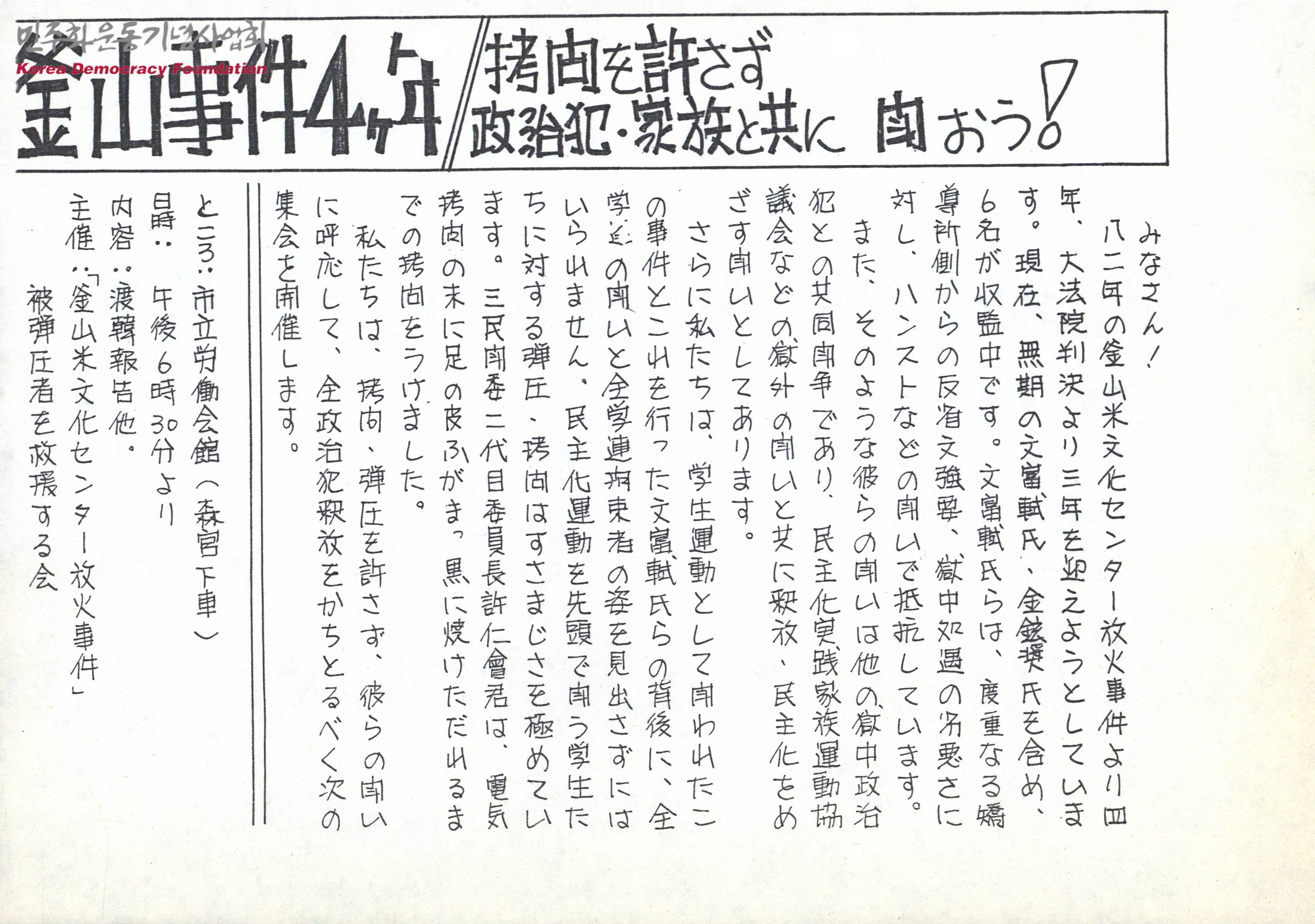 - 82년 부산 미문화원 방화사건이 일어난지 4년, 대법원 판결이 난지 3년을 맞이하고 있으며, 당시 무기징역을 선고받은 문부식, 김은숙 씨를 비롯하여 많은 사람들이 수감 중이라는 내용, 수차례에 걸친 교도소 측의 반성문 강요, 옥중 악행에 대해 단식 등의 방법으로 저항하고 있으며, 다른 옥중 정치범들과 공통투쟁하고 민주화실천가족운동협의회 등 옥중서명과 함께 석방과 민주화를 목표로 하고 있다는 내용 등이 수록된 문서