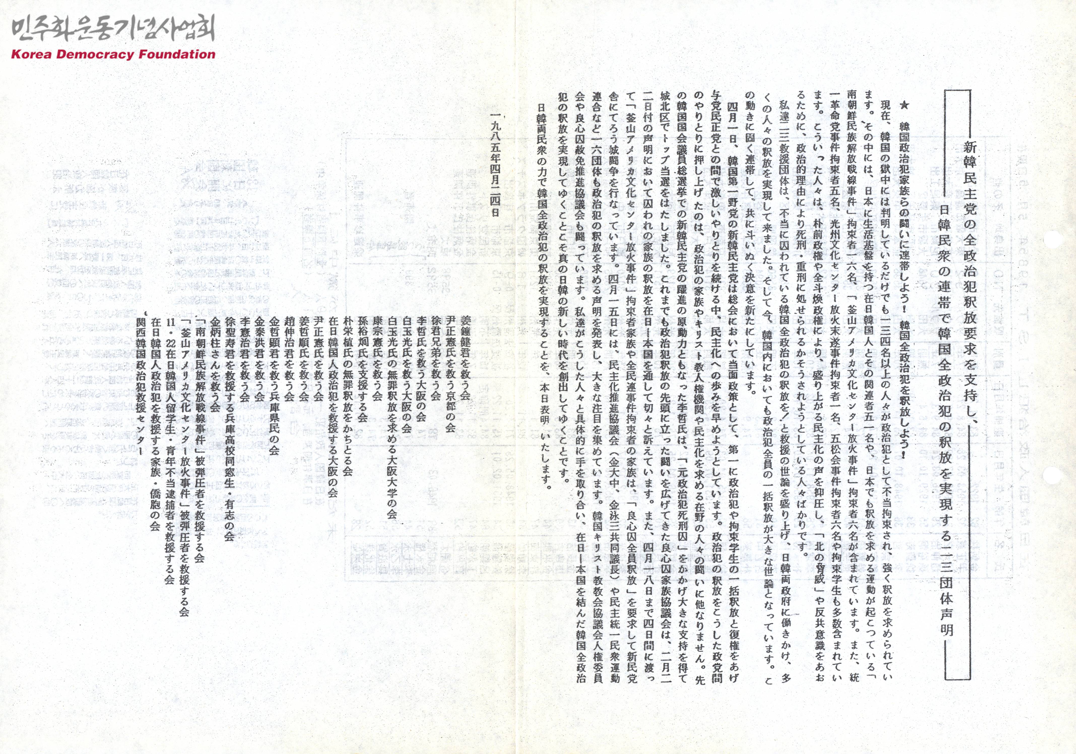 신한민주당의 전 정치범 석방 요구를 지지하며, 한일 민중의 연대로 한국 전 정치범 석방을 실현하는 범일민중연대 23개 단체 성명서