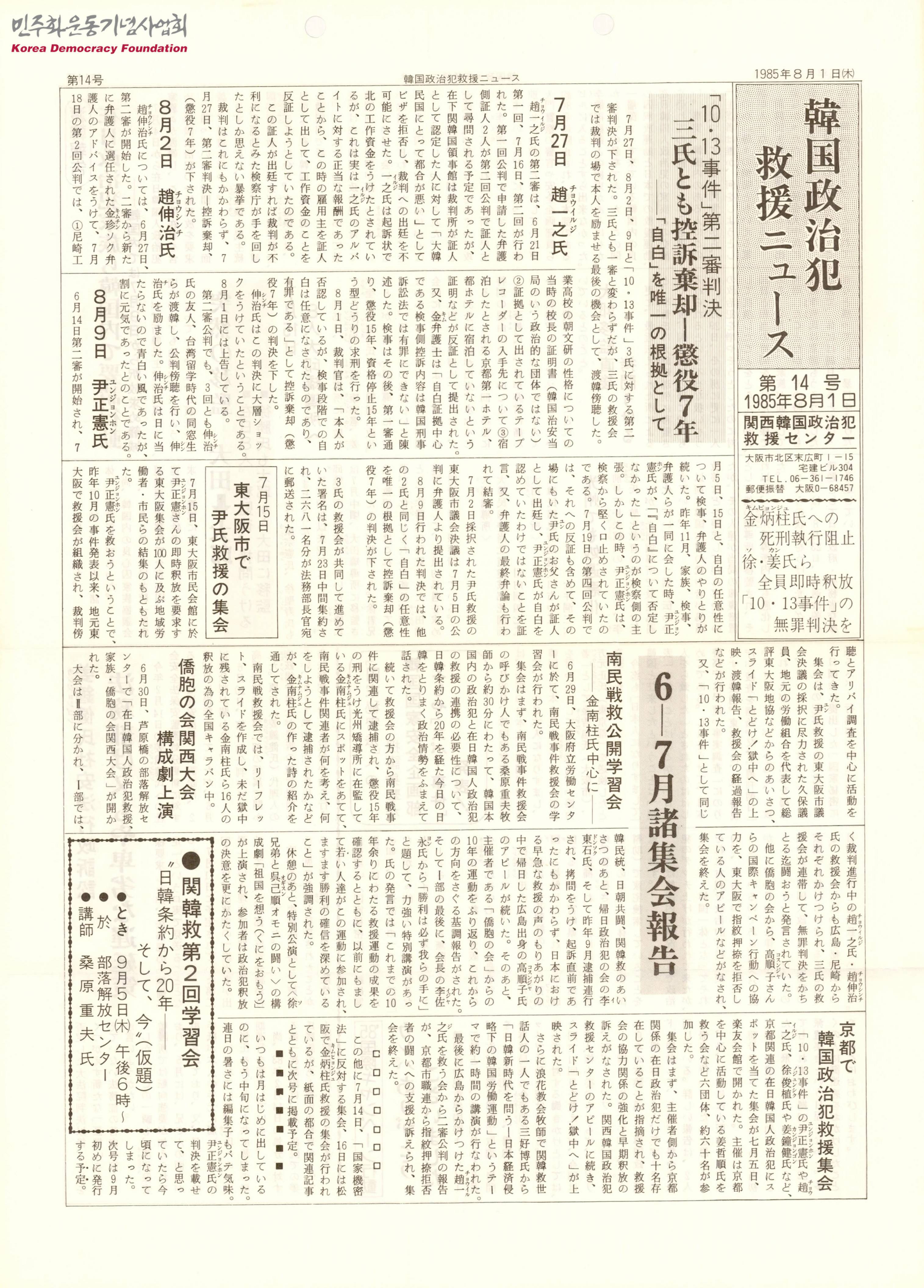 - 오사카부립노동센터에서 남민전사건구원회 발기인 구와하라 시게오 목사의 일본 정치범과 재일동포 정치범 구원의 연계의 필요성과 남민전 사건과 관련하여 체포되어 징역 15년 형을 받고 광주교도소에 수감되어 있는 김남주 씨에 대한 소개 등이 진행된 학습회가 열렸다는 내용, 재일 한국인 정치범 가족들이 방한해 재일 한국인을 포함한 전 한국 정치범의 일괄 석방을 요구하며 투쟁하고 있는 인권단체 등을 면담하고 요청했다는 내용 등이 수록된 정간물