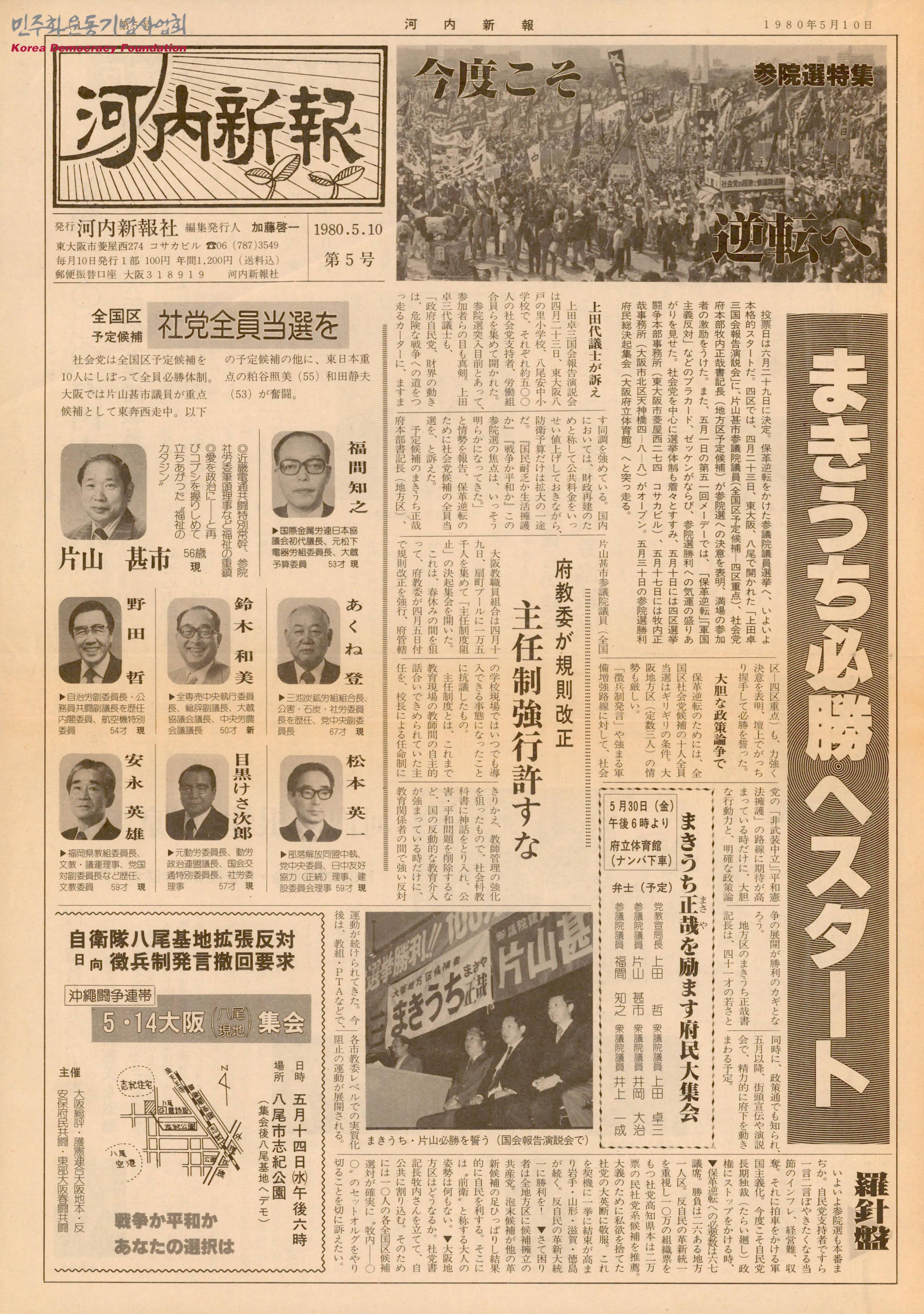 - 사회당은 전국구 예정 후보를 10명으로 압축해 전원 필승체제를 갖추고 있으며 오사카에서는 가타야마 진이치 의원이 중점 후보로 동분서주 하고 있다는 내용, 참의원 선거가 시작되면서 장기 독재 정권을 이어가는 자민당에 의해 당면한 인플레이션, 경영난, 수탈, 군국주의화에 제동을 걸고 반전을 위해 필요한 의석수는 67석이라는 내용 등이 수록된 정간물