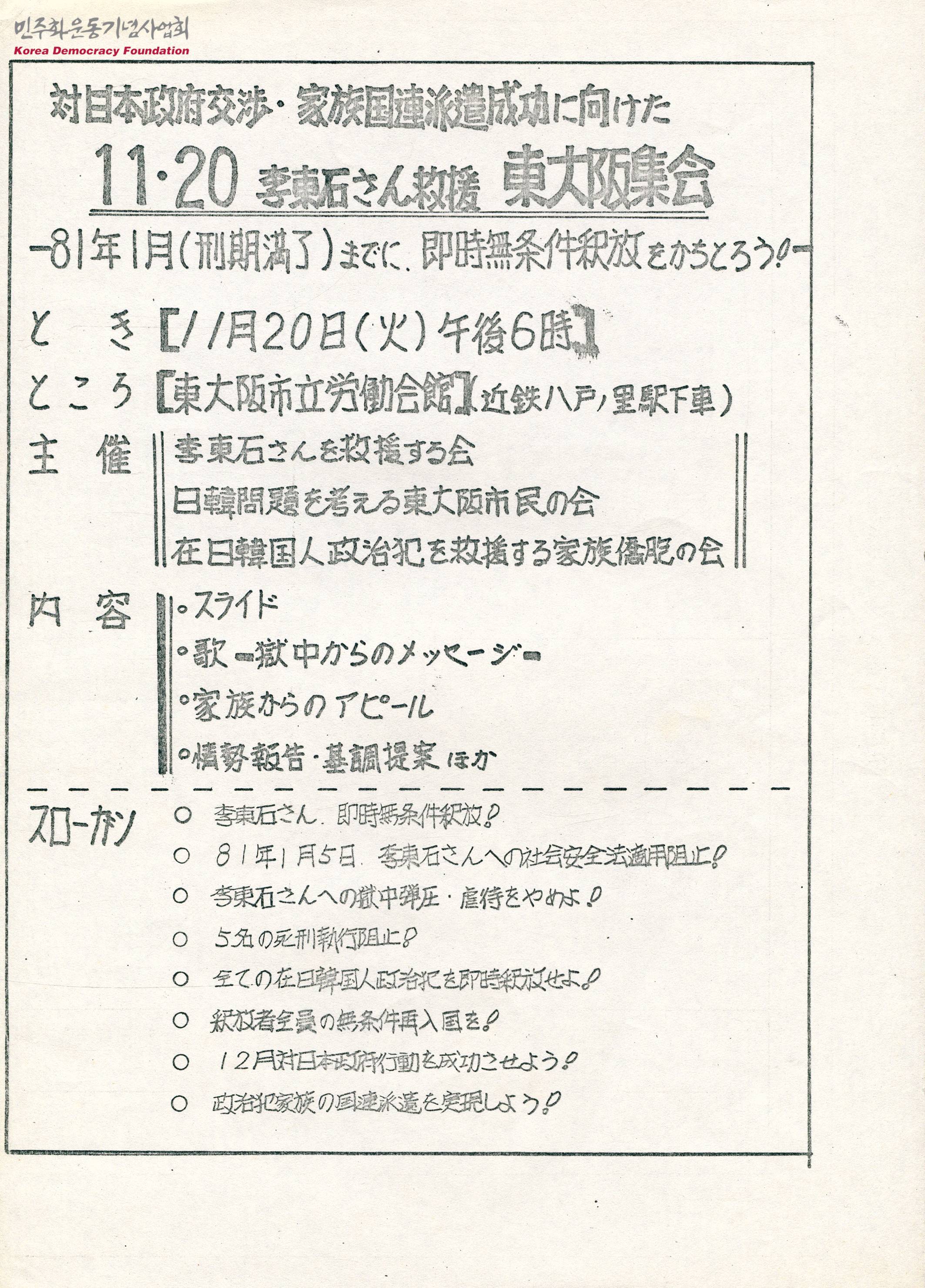 - 대일본 정부 협상, 가족 UN 파견 성공을 위한 11.20 이철 씨 구출 오사카 집회의 일정을 안내하는 내용이 수록된 문서로 슬로건은 다음과 같음 - 이동석 씨 즉각 무조건 석방! - 81년 1월 5일 이동석 씨에 대한 사회안전법 적용을 저지하라! - 이동석 씨에 대한 옥중 탄압과 학대를 중단하라! - 5명의 사형집행 저지! - 모든 재일한국인 정치범을 즉각 석방하라! - 석방자 전원의 조건 없는 재입국을! - 12월 대일본 정부 행동을 성공시키자! - 정치범 가족의 유엔 파견을 실현하자!