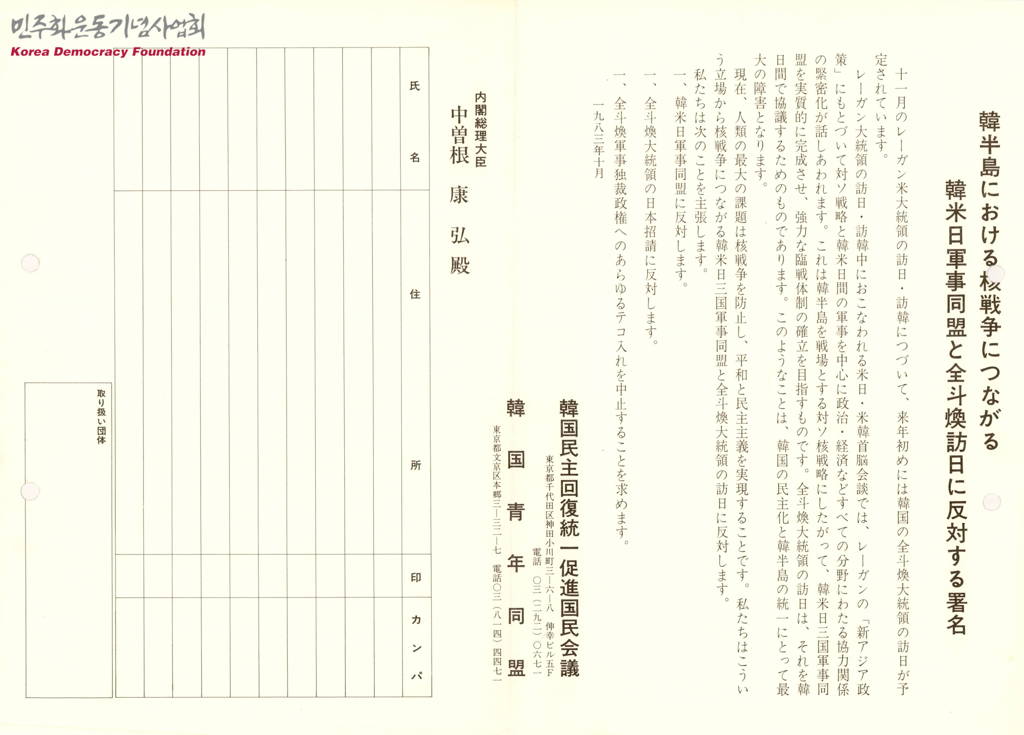 - 인류의 최대 과제는 핵전쟁을 막고 평화와 민주주의를 실현하는 것이며, 이러한 입장에서 핵전쟁으로 이어지는 한-미-일 3국 군사동맹과 전두환 대통령의 방일을 반대한다는 내용이 수록된 문서로 주장은 다음과 같음 - 한-미-일 군사동맹을 반대한다 - 전두환 대통령의 일본 초청에 반대한다 - 전두환 군사독재정권에 대한 모든 지원을 요구한다