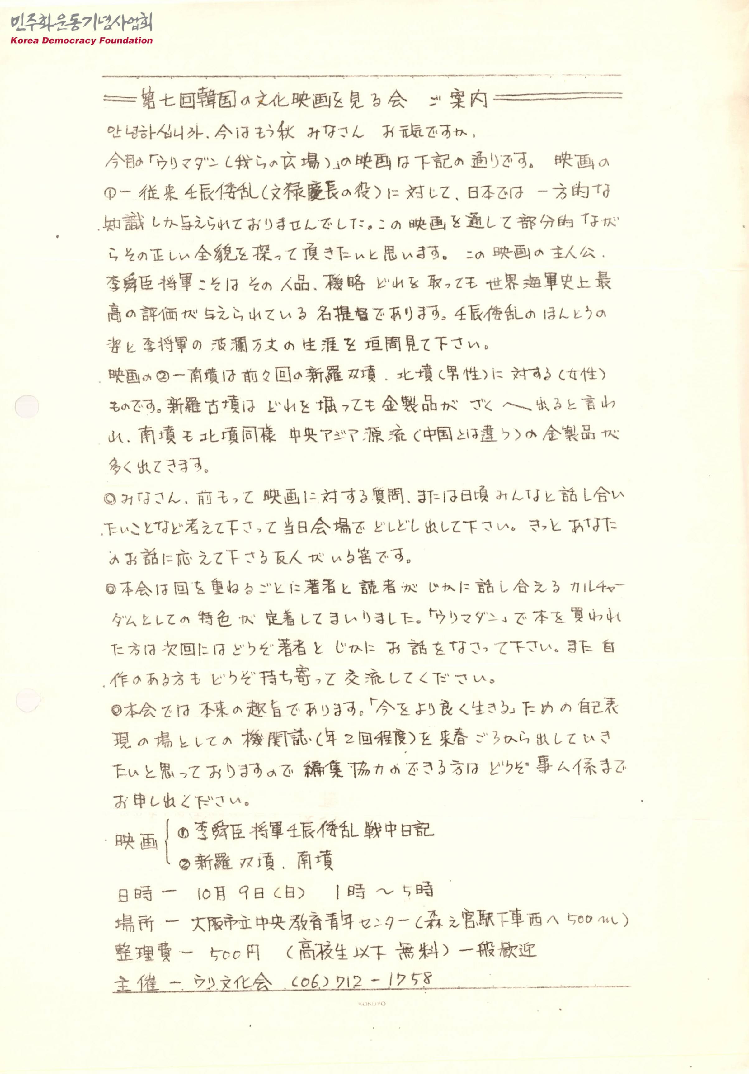 - 일본의 일방적인 임진왜란에 대한 지식 이외에 임진왜란과 관련해 이순신의 생애를 다룬 영화와 신라의 황남대총을 다룬 영화를 상영함을 알리며, 이에 많은 참석을 바란다는 내용의 문서