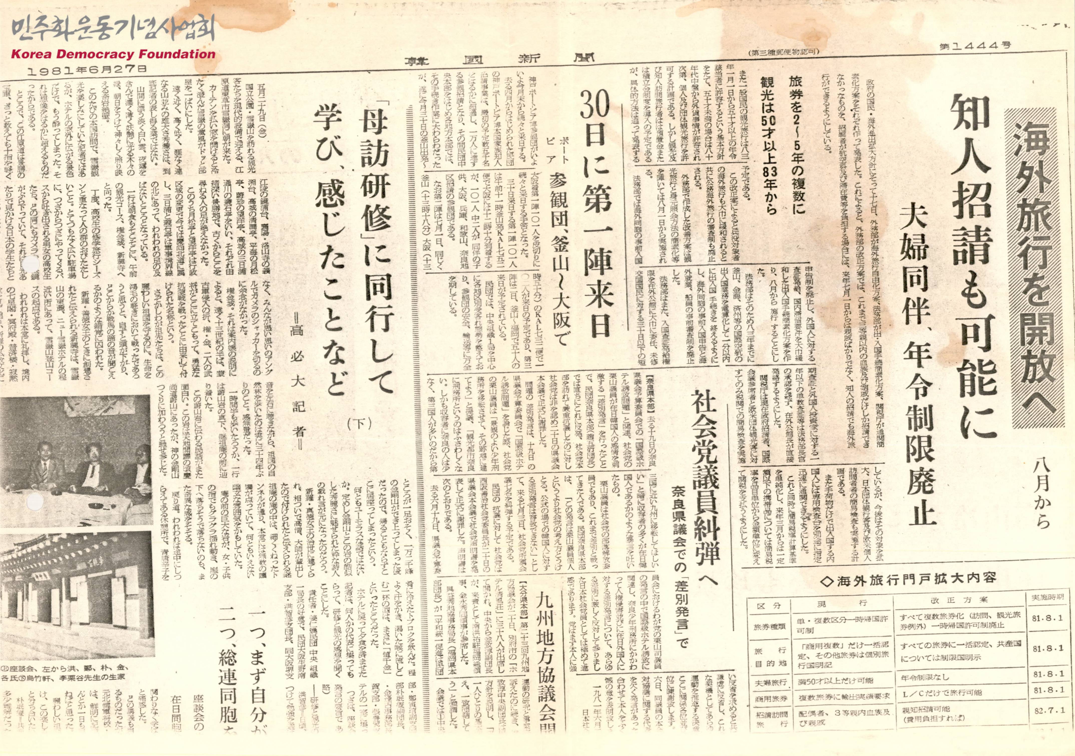 - 한국 정부의 국민 해외진출 확대 방침에 따라 외무부의 해외여행 자유화 방안, 법무부의 출입국 절차 간소화 방안, 관세청의 통관 간소화 방안이 각각 발표되었다는 내용의 기사와 고베 포트피아 참관단이 30일부터 일본에 입국한다는 내용의 기사 등이 실린 신문스크랩