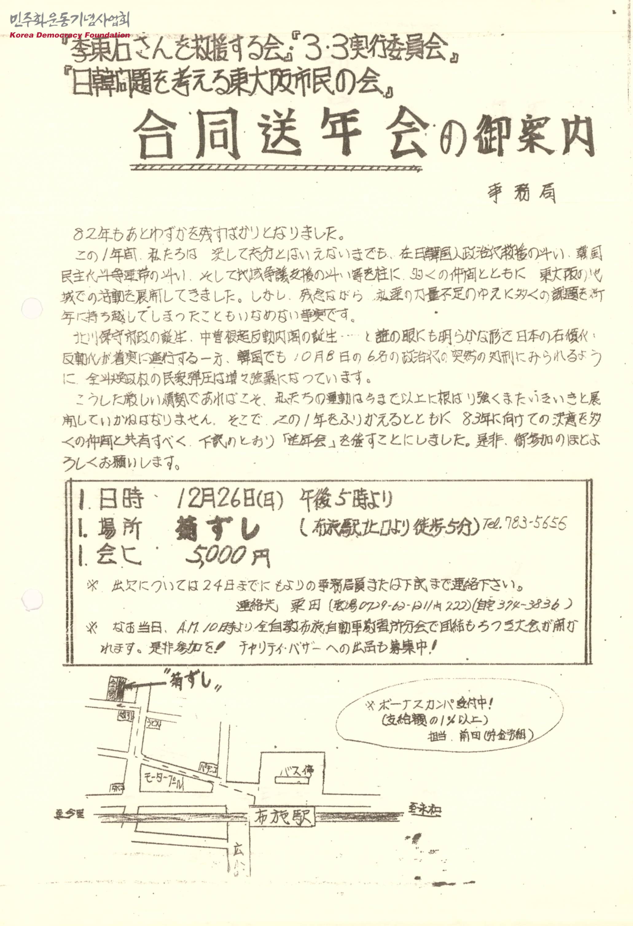 - 일본의 우경화, 한국에서의 신향식을 비롯한 6명에 대한 사형집행 등으로 민중에 대한 탄압이 강해지고 있는 상황에서 82년을 돌아보고 83년을 향한 결의를 함께 공유하기 위해 합동송년회를 개최함을 알리며, 많은 이들의 참석을 요청하는 내용의 안내문