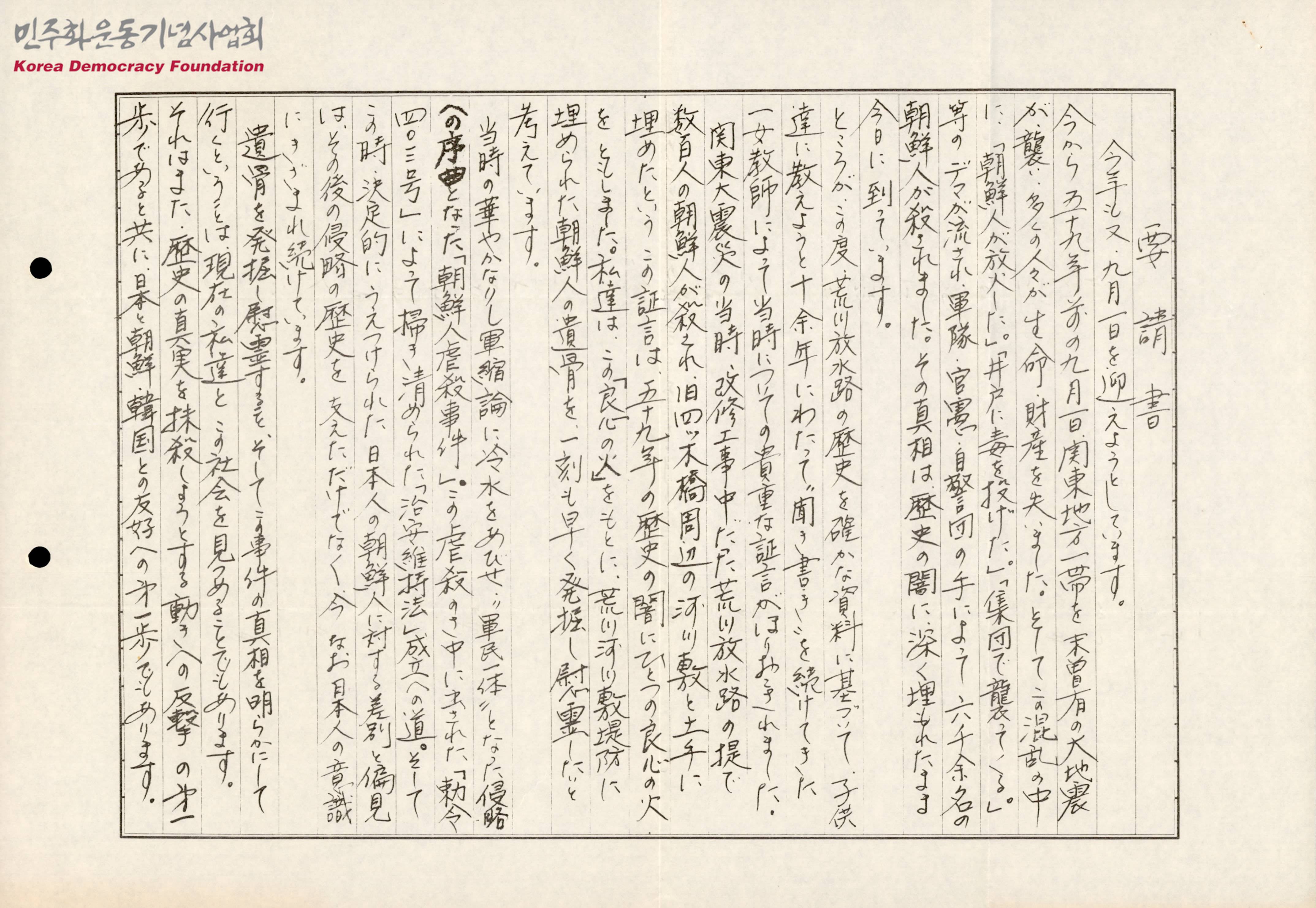 - 관동대학살의 진상을 밝히는 것은 역사를 지우려는 움직임에 대한 반격이자, 일본과 한국·북한을 향한 우호의 행동임을 알리며, 이에 대한 자료집 시판을 위한 모금활동과 현지에서 열리는 집회에 참석을 부탁하는 내용 등이 실린 문서