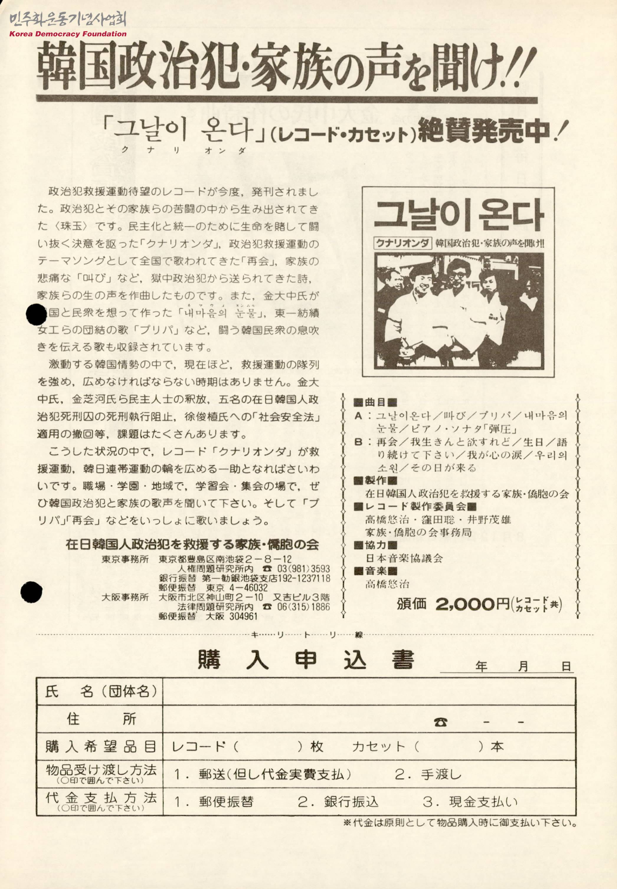 - 정치범 구원 운동을 주제로 제작된 노래가 발간되었음을 알리며, 이 노래가 구원운동과 한일연대운동의 저변을 넓히고, 다양한 장소에서 불리길 소망하는 글과 해당 음반의 발간 소식을 전하는 신문 스크랩이 실린 문서