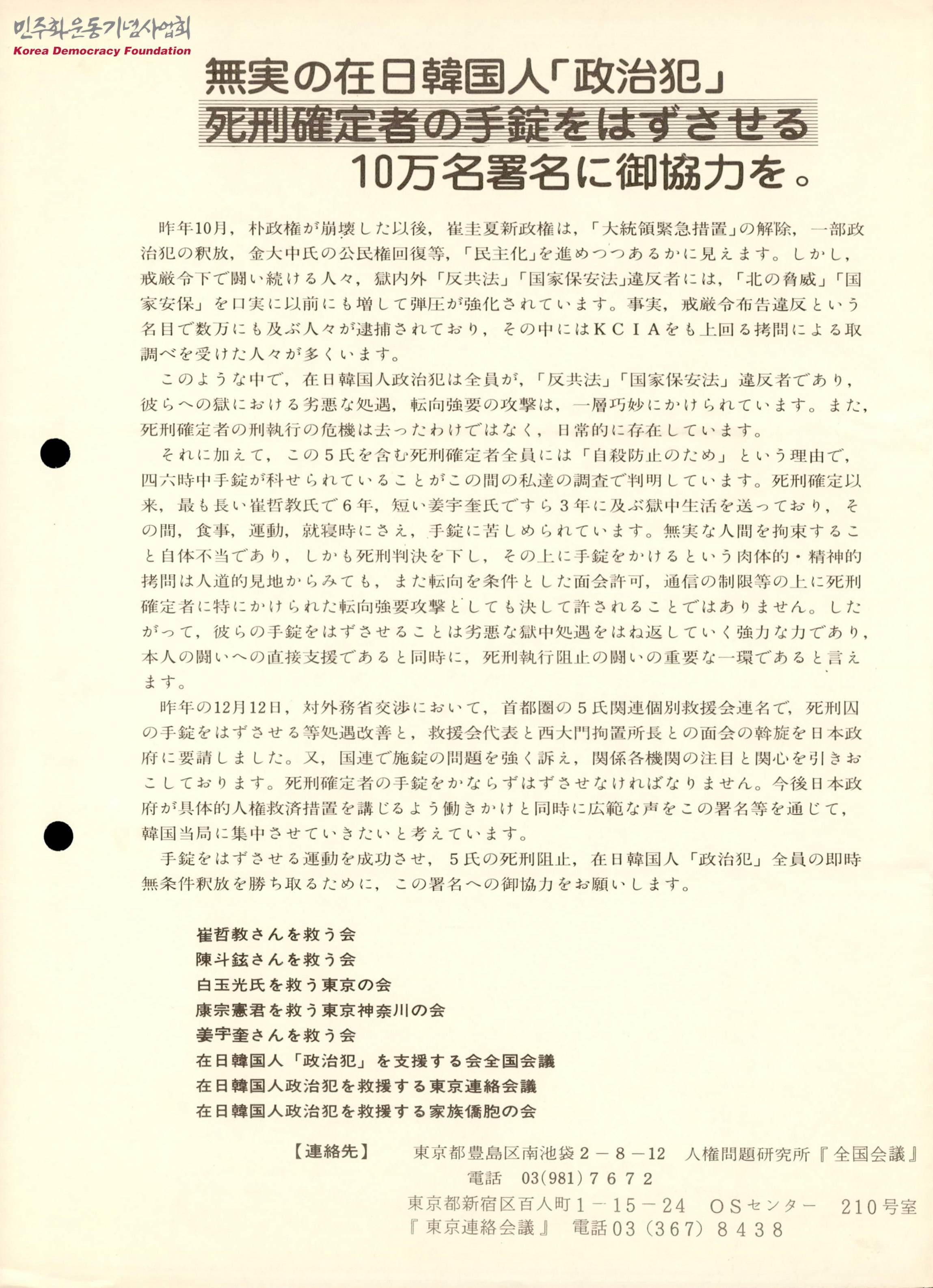 - 백옥광을 비롯한 5명의 재일한국인 사형수들의 사형 집행 저지와 이들의 무조건 석방 쟁취를 위해 서명에 협조해 줄 것을 부탁하는 글과 서명 요망서가 첨부된 문서