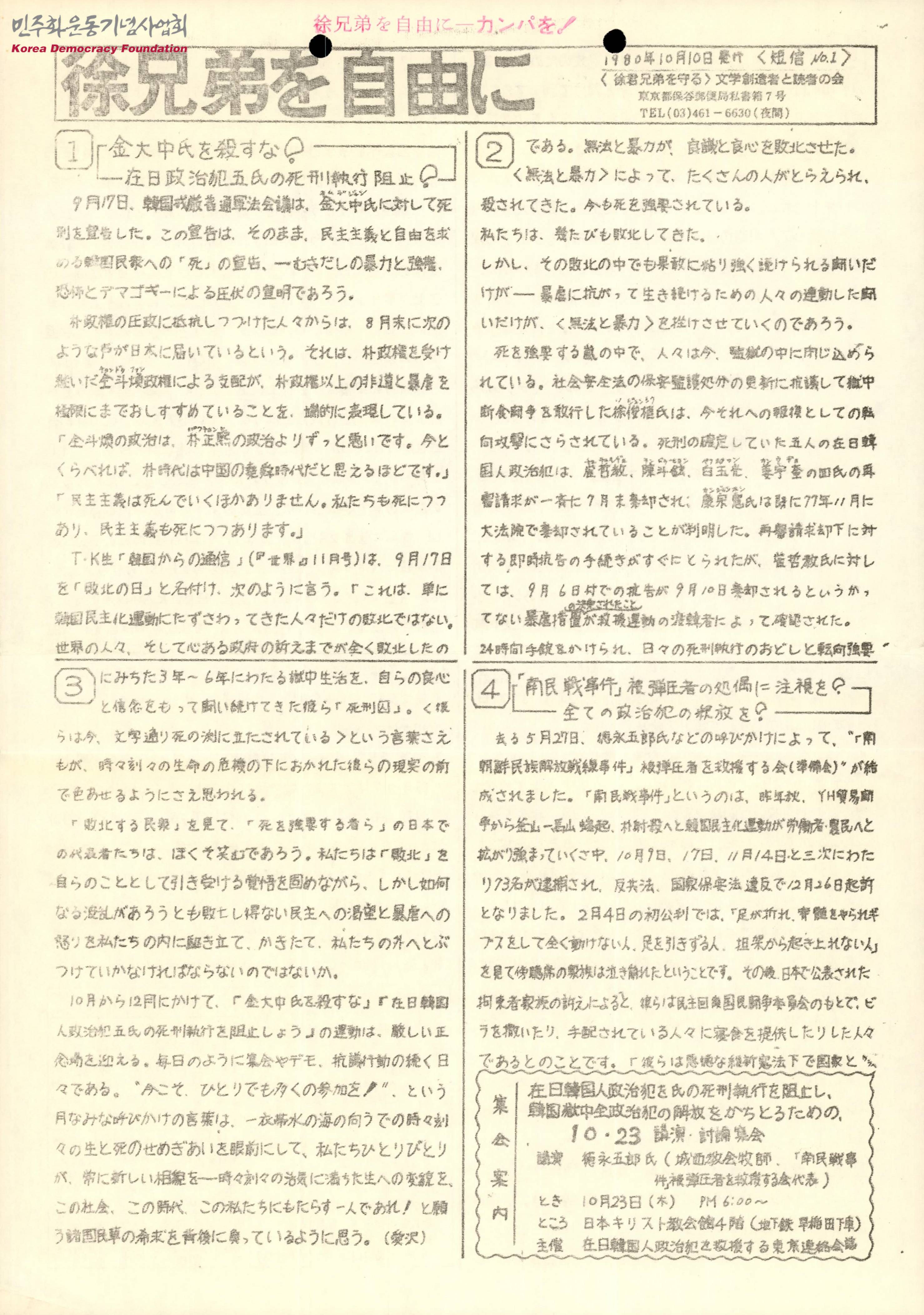 - 김대중과 재일한국인 정치범 5명에게 사형이 집행되지 않도록 관련 활동에 참가를 호소하는 글과 남민전 사건으로 수감된 이들을 비롯한 모든 정치범의 석방을 요구하는 글 등이 실린 정간물