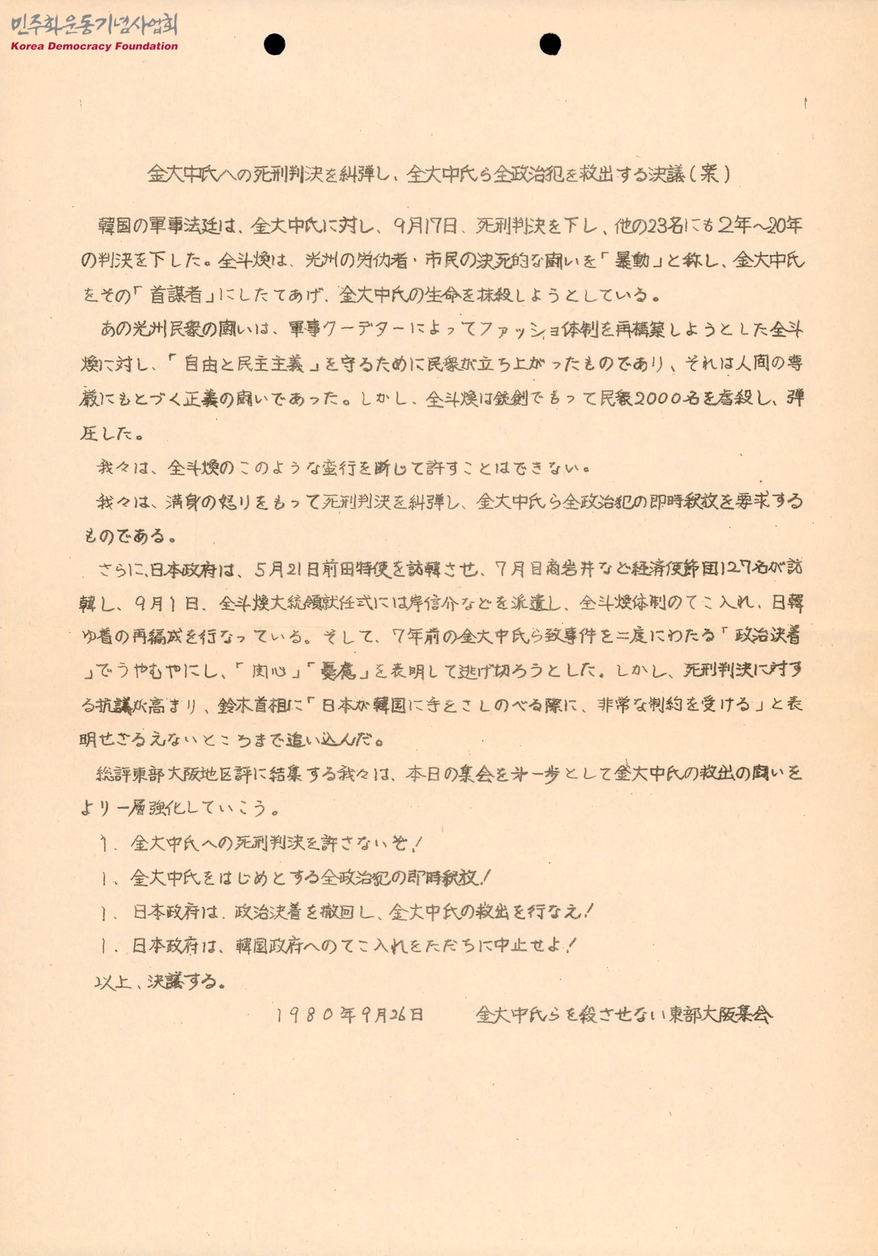 김대중씨에 대한 사형선고를 규탄하고, 김대중씨 등 모든 정치범을 구출하는 결의(안)