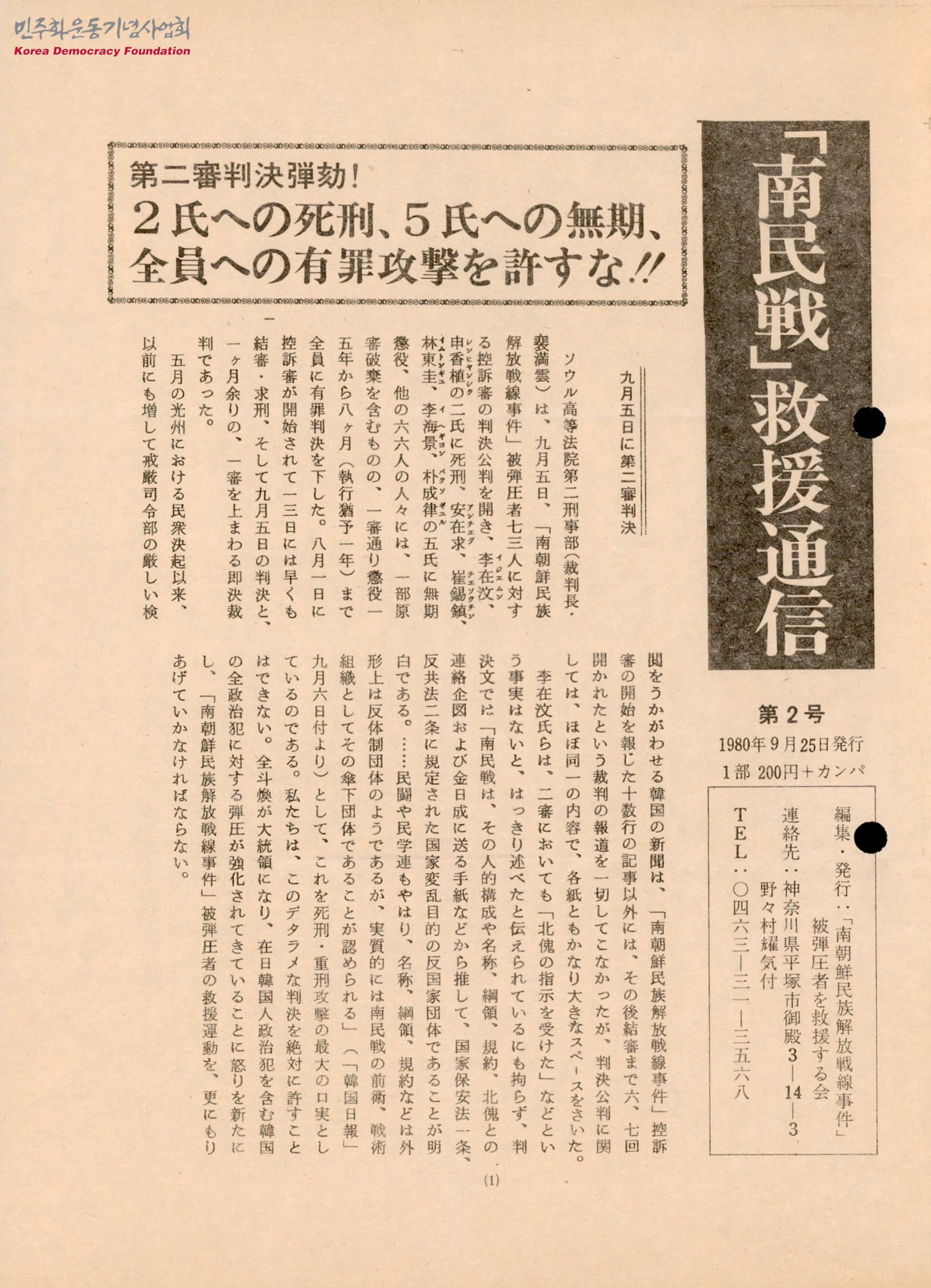 - 남민전 사건 관련자 73명의 항소심 결과를 전하며, 해당 판결을 용납할 수 없으므로, 남민전사건 피탄압자 구호운동을 더욱 적극적으로 전개해 나갈 것임을 밝히는 글과 9월 5일의 항소심 판결 공판을 앞두고 남민전 관련 피구속자 전원의 즉시 석방을 요구하며 진행된 50시간 단식투쟁 소식을 전하는 글 등이 실린 정간물