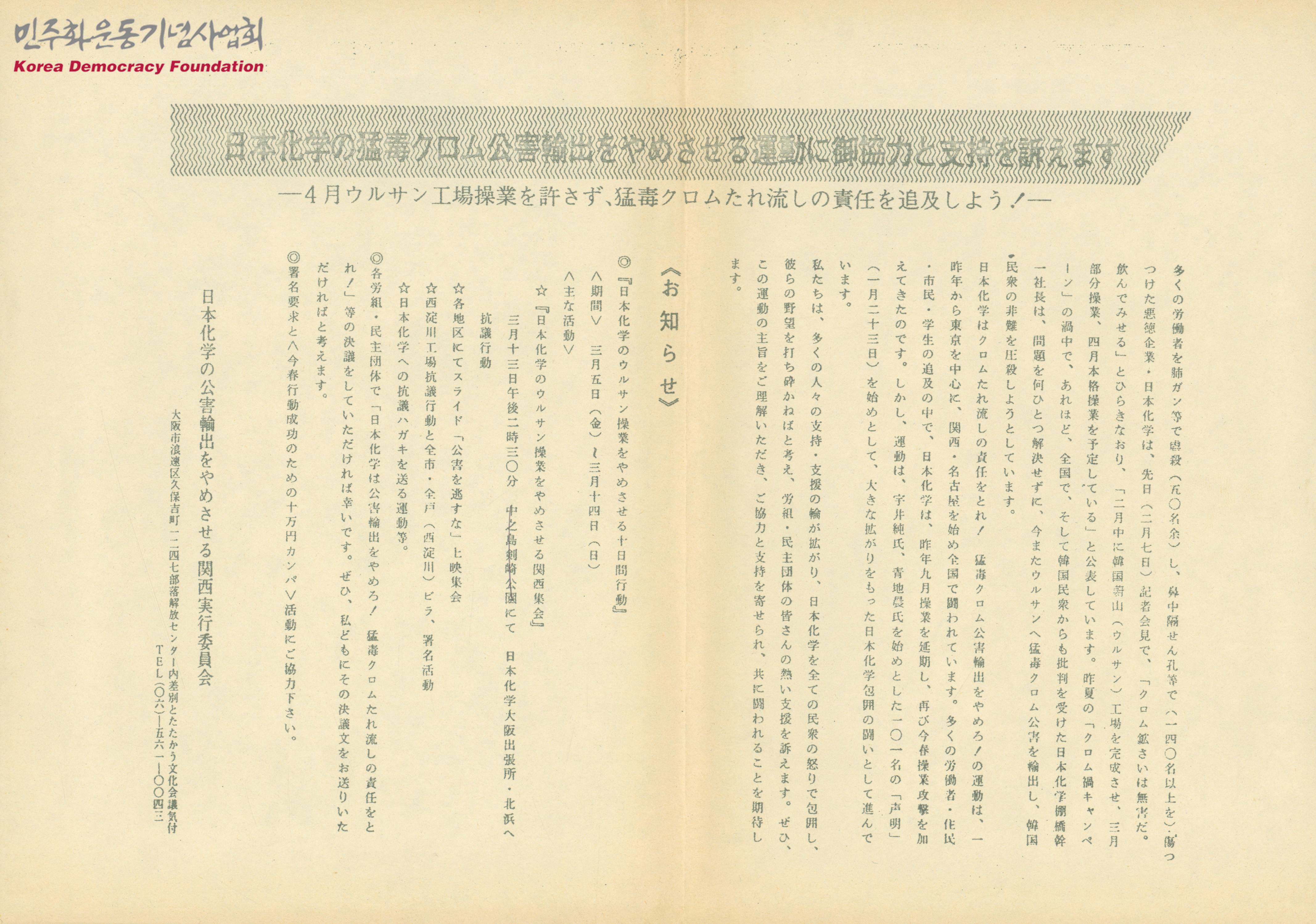 - 많은 노동자들을 폐암 등으로 학살한 악덕기업 일본화학은 최근 기자회견에서 크롬광산은 하다고 밝혔으며, 한국 국민들로부터 비판을 받았던 일본화학 사장은 아무런 문제도 해결하지 않은 채 또다시 울산에 맹독성 크롬을 수출해 한국 국민들의 비난을 무마시키려 하고 있다는 내용, 일본화학은 크롬 유출의 책임을 지고 맹독성 크롬 공해 수출을 중단하라는 내용 등이 수록된 문서