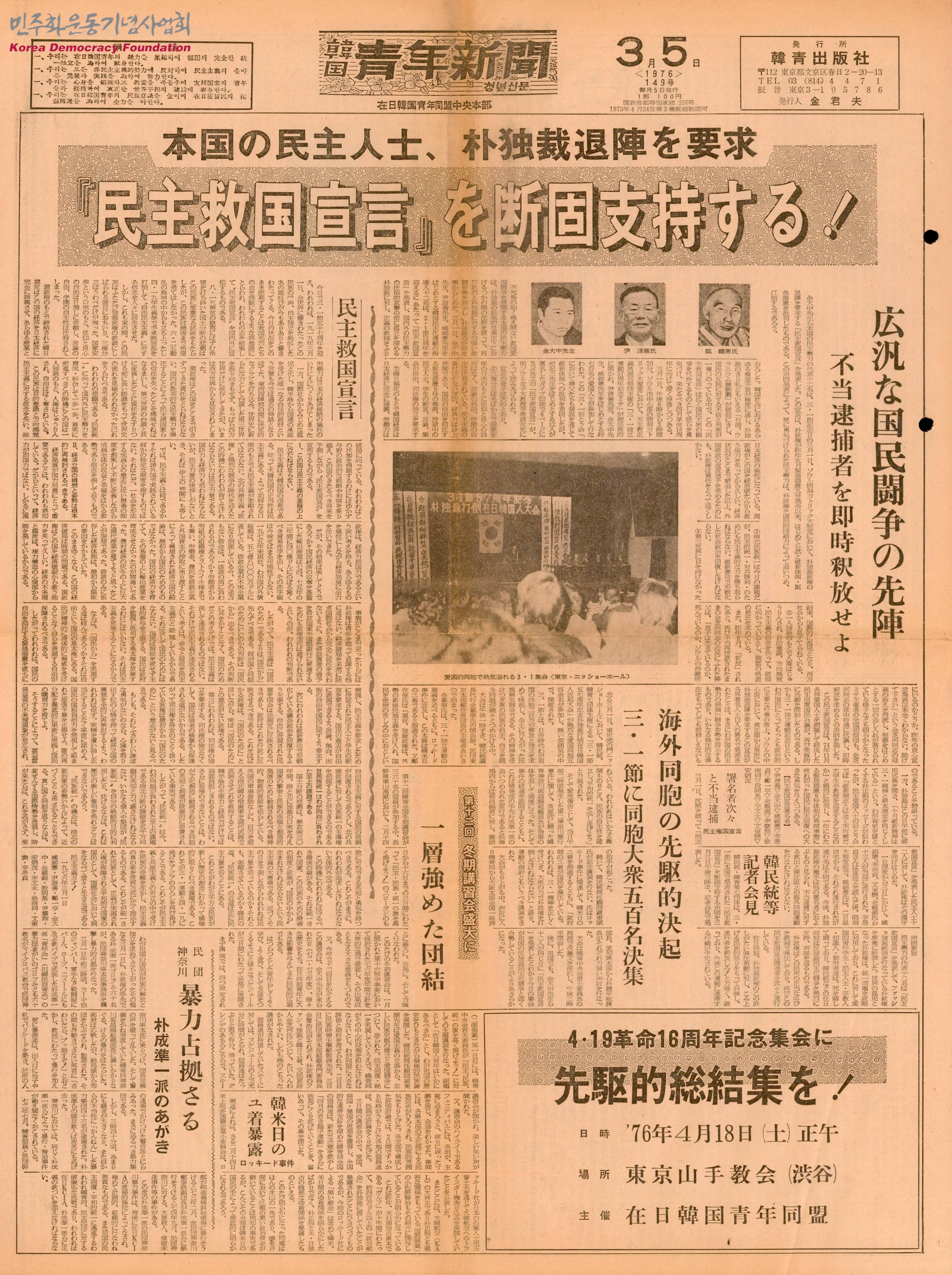 - 김대중 선생 등 민주세력 대표 12명은 3월 1일 서울 명동성당에서 박정희 독재정권의 퇴진을 요구하는 민주 국가 선언을 발표했으며, 이 성명서 발표로 더욱 용기를 얻은 민주세력은 국민적 단결력으로 박정희 정권을 추격하여 타도할 것이라는 내용, 한국 내에서 김지하 선생의 작품이 합법화되지 않았으며, 국내는 물론 해외에 있는 민주 인사들이 김지하 선생의 작품을 체계적으로 읽고 배우고 싶다는 일념을 갖고 있다는 내용 등이 수록된 정간물