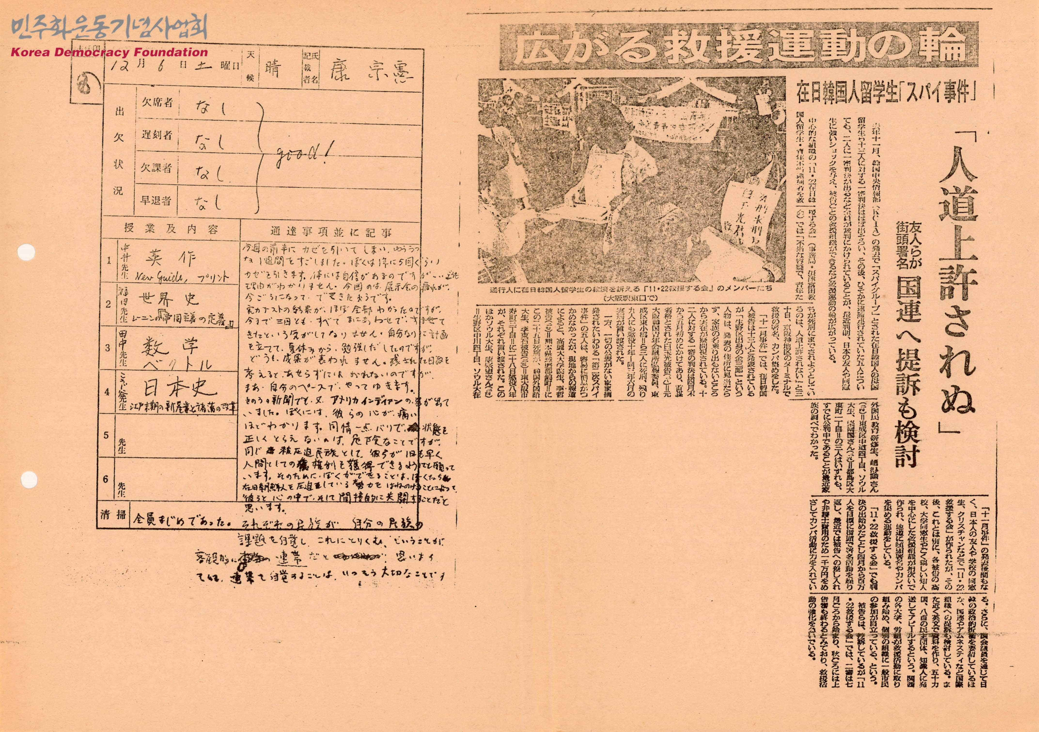- 재일한국인 유학생 간첩단 사건은 인도주의상 허용되지 않는 일이며 이에 대해 서명운동이 전개되는 등 구호운동의 고리가 확장되고 있다는 신문스크랩과 강종헌의 생활기록부가 수록된 문서