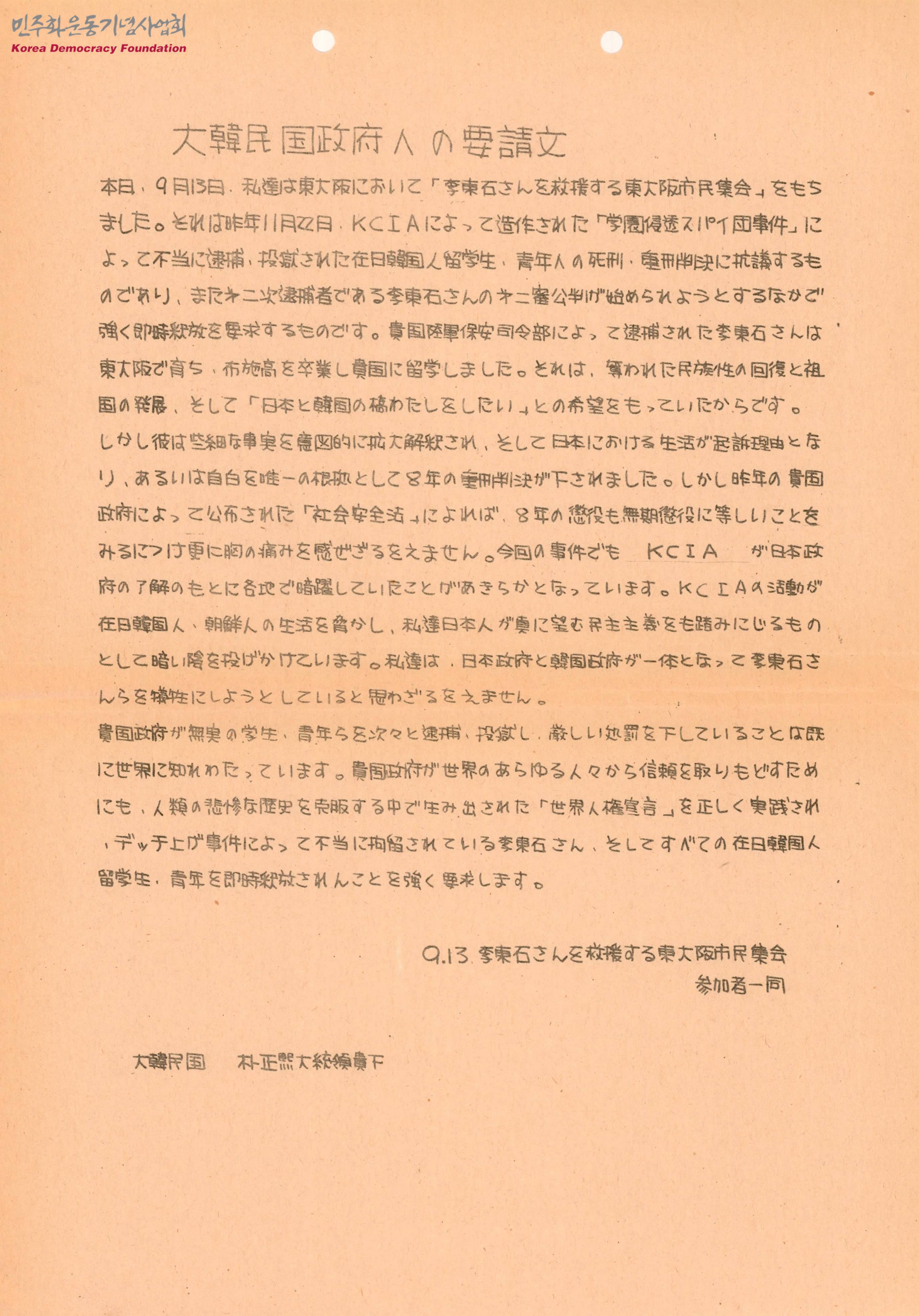 - 9.13이동석씨를구원하는히가시오사카시민집회 참가자 일동