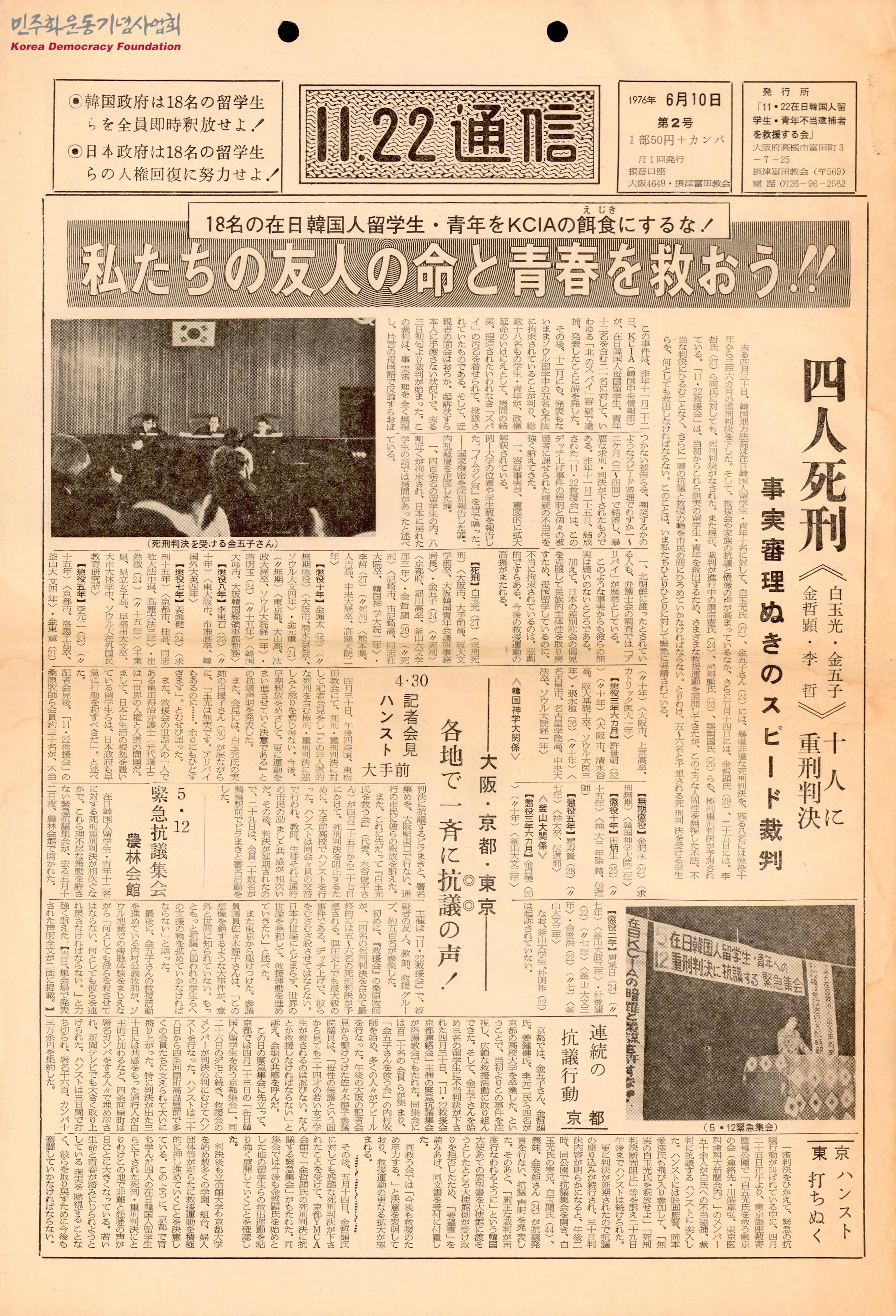 - 18명의 재일한국인 유학생들이 고문과 조작으로 얼룩진 재판을 통해 중형을 받게 되었다고 말하며 우리 손으로 그들을 구하자는 내용의 글, 국제엠네스티 사무총장이 일본을 방문해 유학생들의 가족과 회담을 가졌다는 글, 재일교포 2세와 3세의 모국유학제도에 대한 글 등이 수록된 소식지