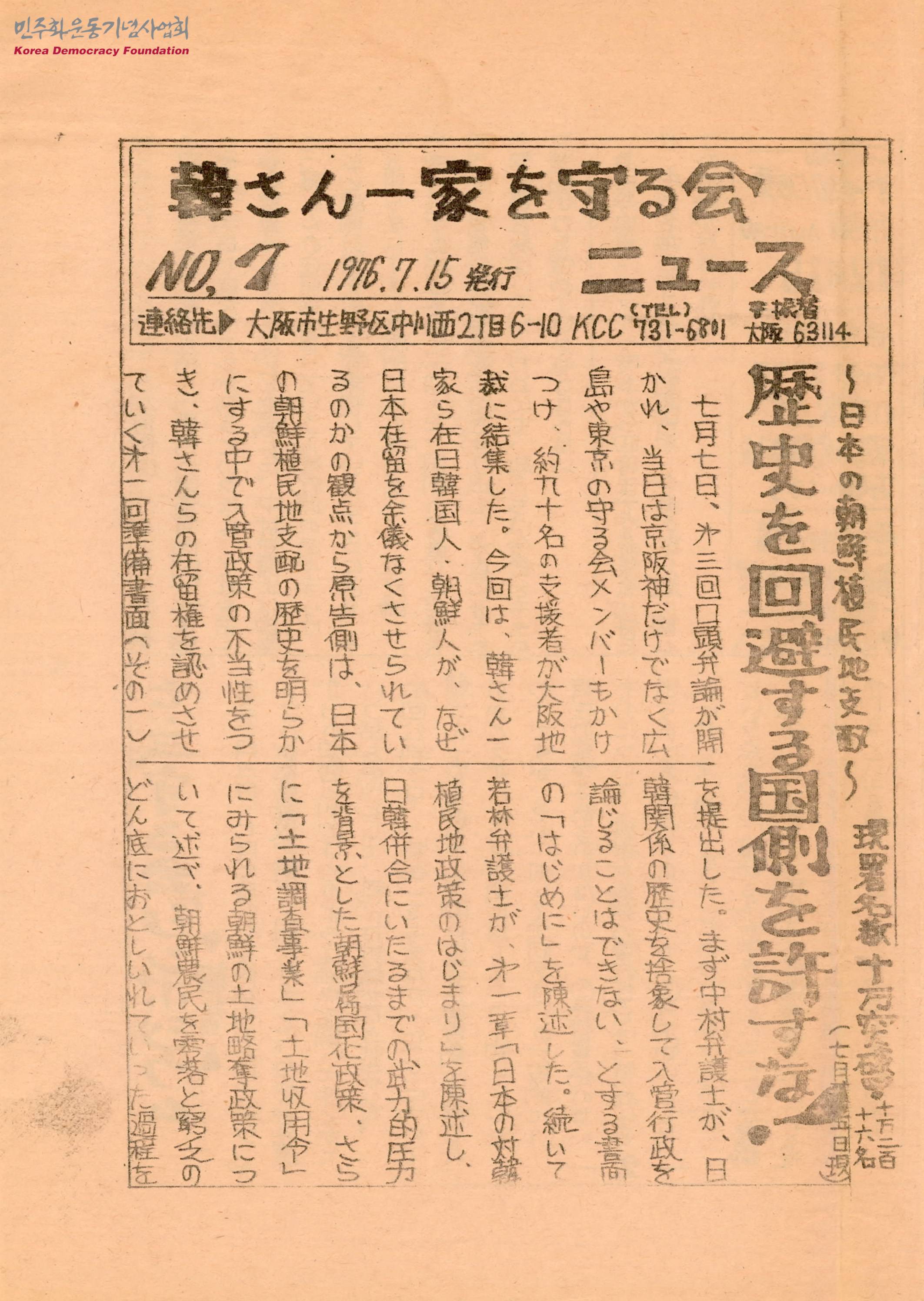 - 한 씨의 집안은 식민지 사회에서 어쩔 수 없이 일본에 체류하게 되었지만 일본 법원이 이를 인정하지 않고 있다고 말하며 역사를 회피하는 나라를 용서하지 말자는 내용의 글, 한 씨의 체류자격에 대한 제3회 공판을 준비하는 심포지엄이 열렸고 변호로 부터 어떤 논점으로 싸워나갈지를 중점으로 토론이 이루어졌다는 글, 한 씨의 체류자격을 위한 교토 지킴이 모임의 활동보고 등이 수록된 소식지