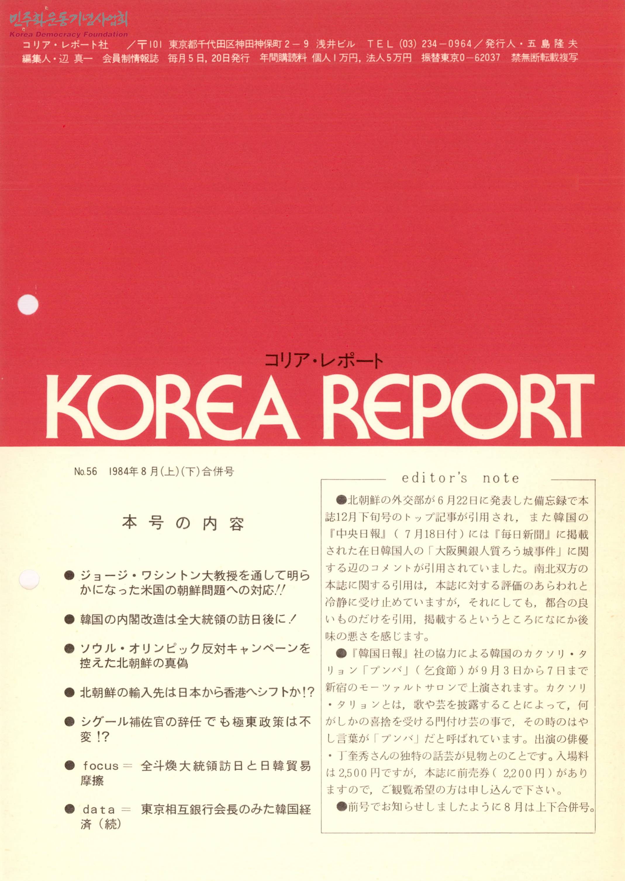- 조지 워싱턴대학교 교수가 밝힌 미국의 한반도 문제에 대한 대응내용, 한국의 내각개조는 전두환의 방일 후에 이루어 진다는 글 등이 수록된 정간물로 목차는 다음과 같음 -조지 워싱턴대 교수를 통해 밝혀진 미국의 조선문제에 대한 대응!! -한국의 내각개조는 전 대통령의 방일 후에! -서울올림픽 반대 캠페인 앞둔 북의 진위 -북한 수입처는 일본에서 홍콩으로 이동하나!? -시구루 보좌관의 사임에도 극동정책은 불변!? -focus = 전두환 대통령 방일과 한일 무역 마찰 -data = 도쿄 상호은행 회장이 본 한국경제
