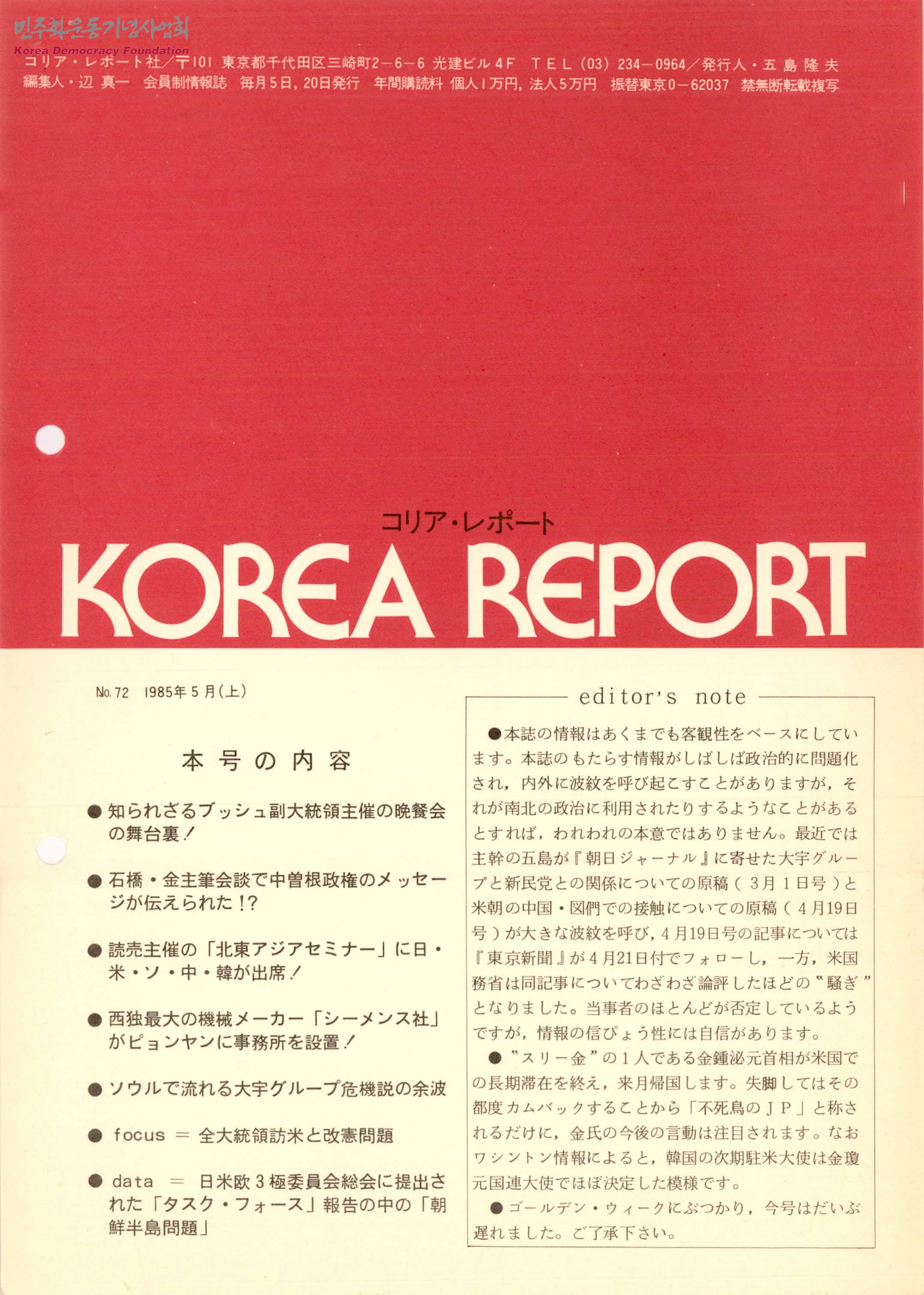 - 요미우리가 주최한 동북아 세미나에 대한 글, 대우그룹의 경제적 위기에 대한 글, 전두환 대통령의 방미와 개헌에 대한 글 등이 수록된 정간물로 목차는 다음과 같음 -알려지지 않은 부시 부통령 주최 만찬의 무대 뒤! -이시바시 김주필 회담에서 나카소네 정권의 메시지가 전해졌다!? -요미우리 주최 '동북아 세미나'에 일·미·서·중·한 참석! -서독 최대의 기계 제조업체 "지멘스사" 평양에 사무소를 설치! -서울 대우그룹 위기설 여파 -focus = 전 대통령 방미와 개헌 문제 -data = 미·일·유럽 3극 위원회 총회에 제출된 '태스크포스' 보고 속 '조선반도 문제'