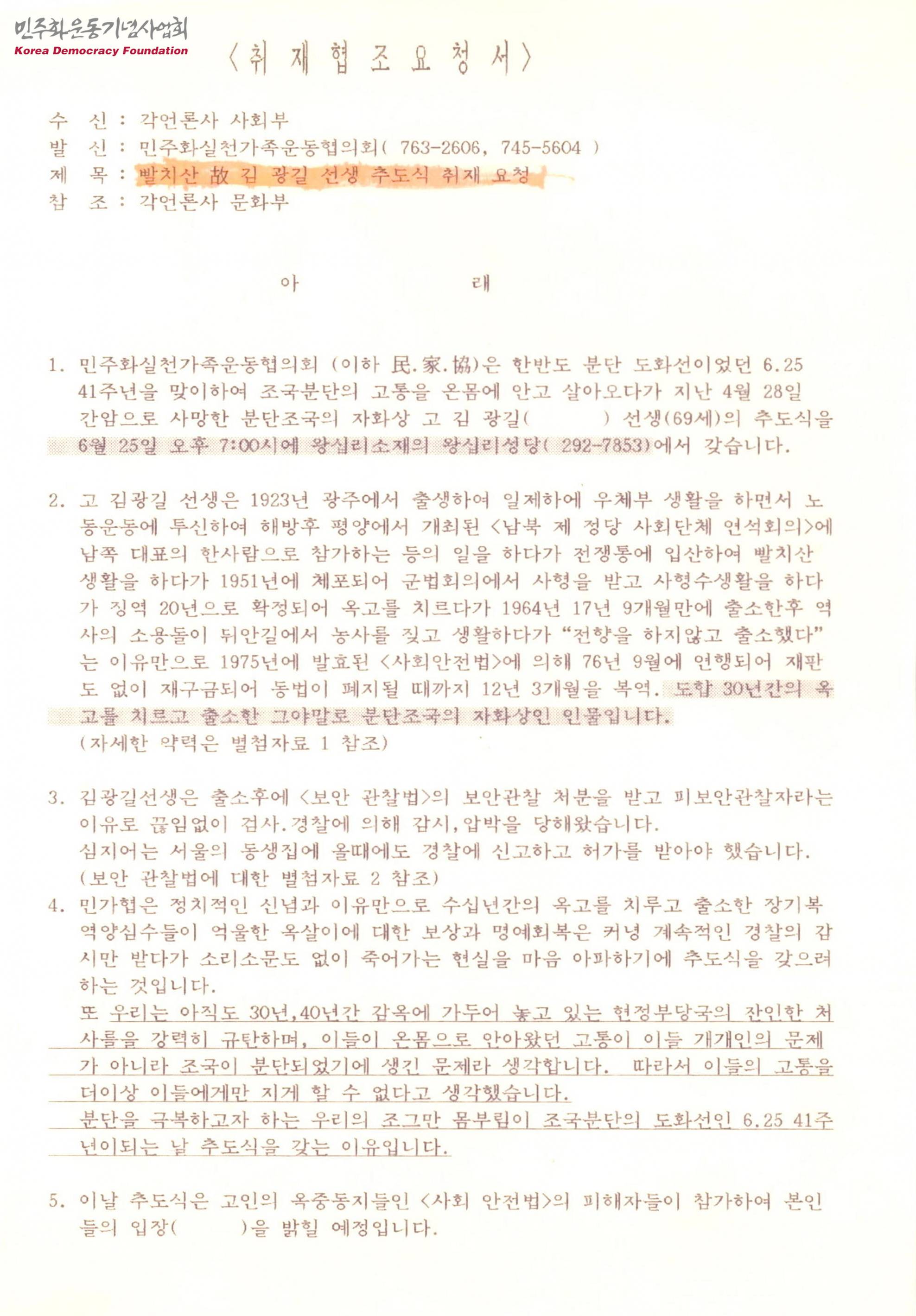 - 30년간의 옥고를 치르고 출소한 분단조국의 자화상격의 인물인 김광길의 추도식이 분단을 극복하고자 하는 우리의 몸부림의 표현이라고 말하며 행사를 취재해 줄 것을 요청하는 내용의 문서로 김광길의 약력과 보안관찰법에 대한 설명이 첨부됨