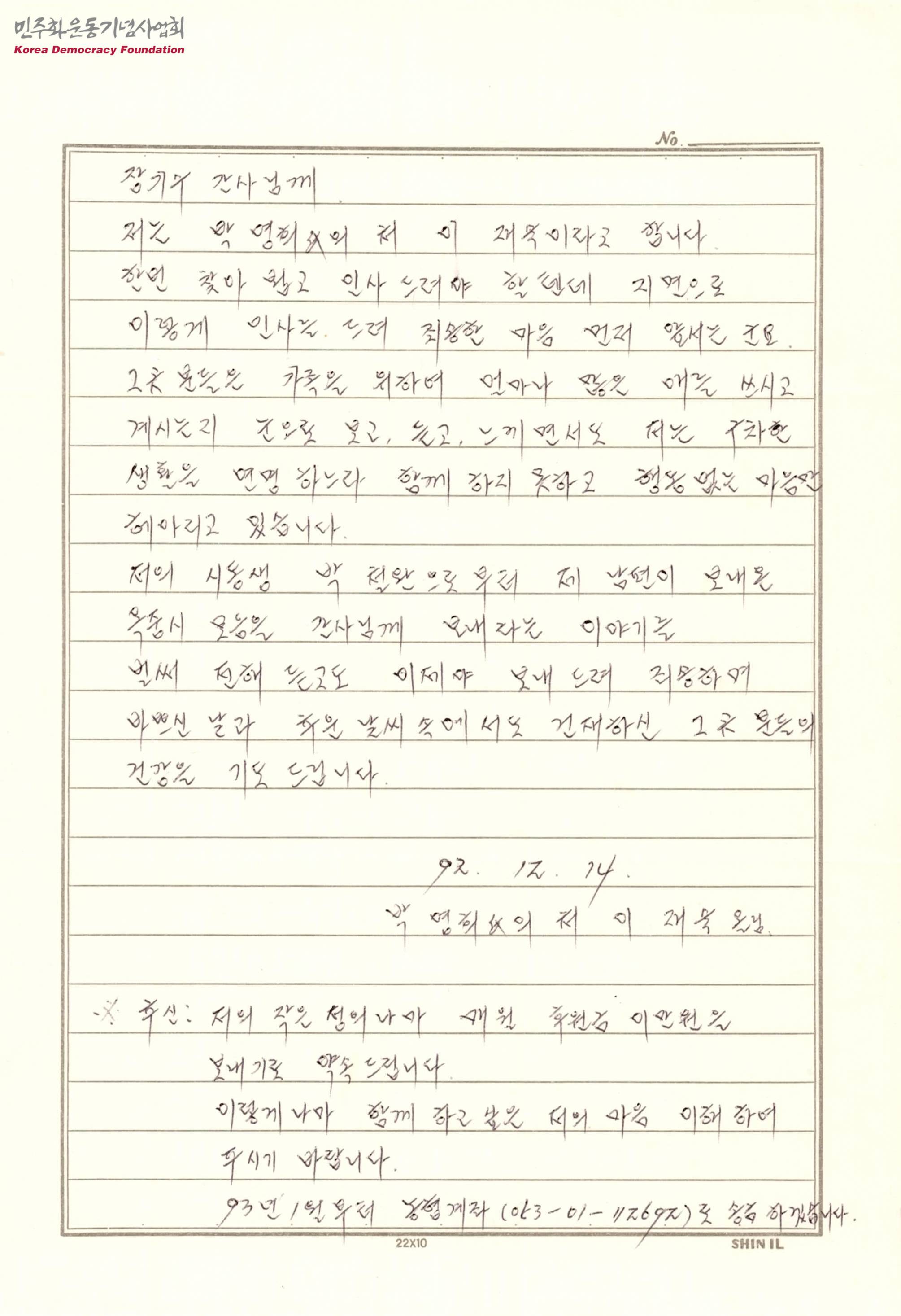 - 장기수 박명희의 처가 남편이 보내온 옥중시 모음을 장기수 간사에게 보낸다는 내용의 서신