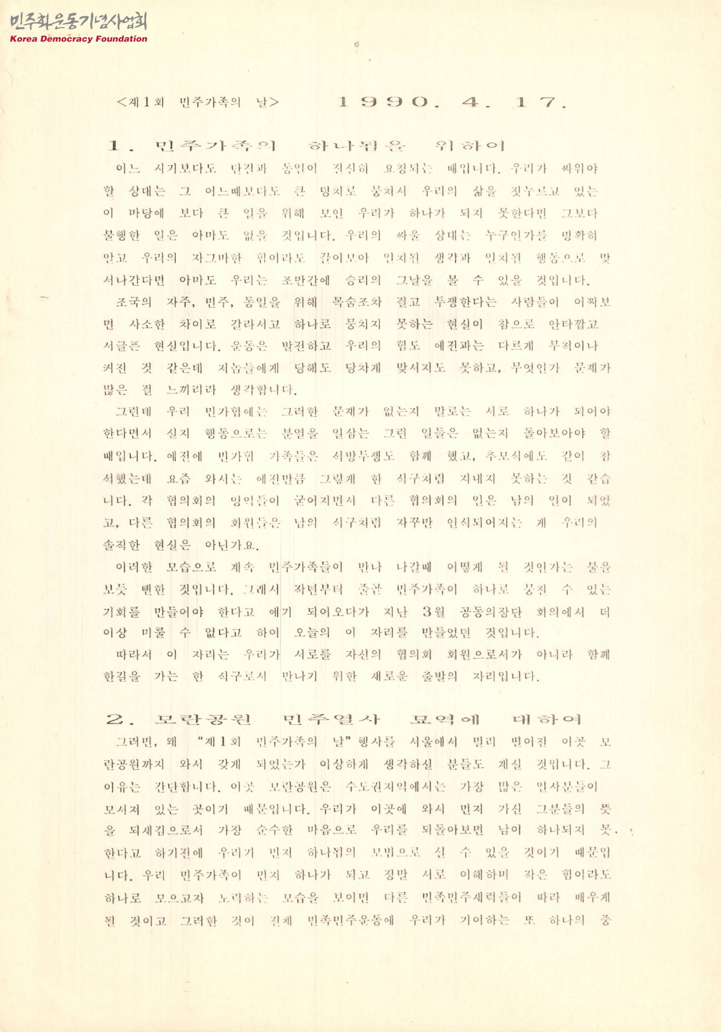 - 함께 석방 투쟁을 진행해야 하는 민가협 가족들이 예전처럼 한식구처럼 지내지 못하고 있다고 말하며 함께 한길을 가는 한 식구로서 만나기 위해 마련한 행사의 안내문으로 목차는 다음과 같음 1. 민주가족의 하나됨을 위하여 2. 모란공원 민주열사 묘역에 대하여 3. 더 이상의 죽음을 막아야 합니다 -함께 부르는 노래