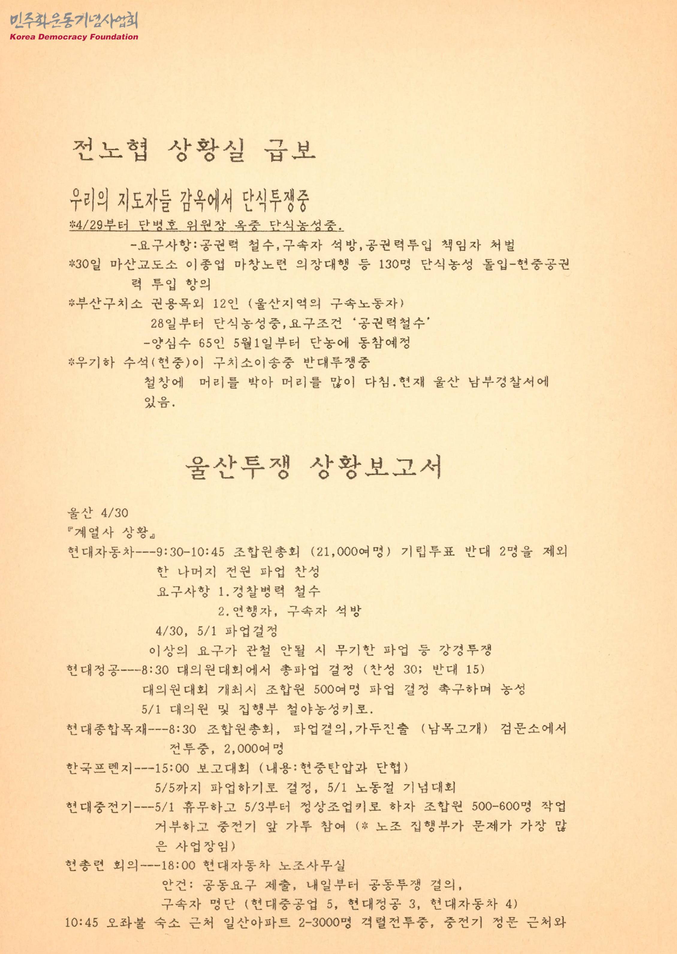 - 단병호 위원장을 비롯한 전노협 지도자들이 감옥에서 단식투쟁을 진행하고 있다는 것, 울산 현대계열사들의 투쟁 상황 보고, KBS조합원의 비대위 결정에 대한 투표에 경찰이 투입되어 400여명의 농성조합원이 연행되었다는 것 등의 투쟁 소식이 적혀있는 문서